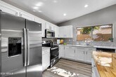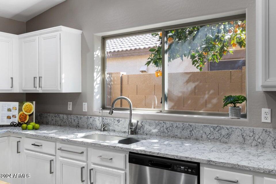 Stunning single-story,3-bedroom plus den home with views of the golf course! Located in the heart of Downtown Queen Creek,this community is close to shops,eateries,and the extensive Sonoqui Creek Trail system. The home boasts a split floor plan,a large family room,and an upgraded kitchen featuring a new island,quartz countertops,and stainless steel appliances. Enhanced lighting is found throughout. The master bedroom includes a bay window overlooking lush golf greens and a full en-suite bathroom with a spacious walk-in closet. The garage is well-appointed with plenty of cabinets,a utility sink,and an immaculate epoxy floor. Enjoy the extended paver patio with a pergola and a stunning view! Your dream home is here!