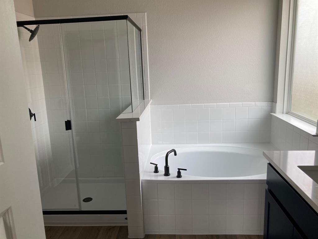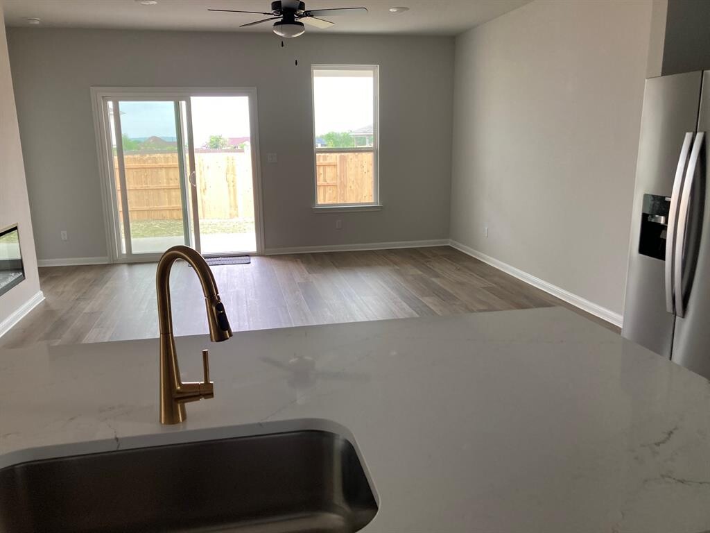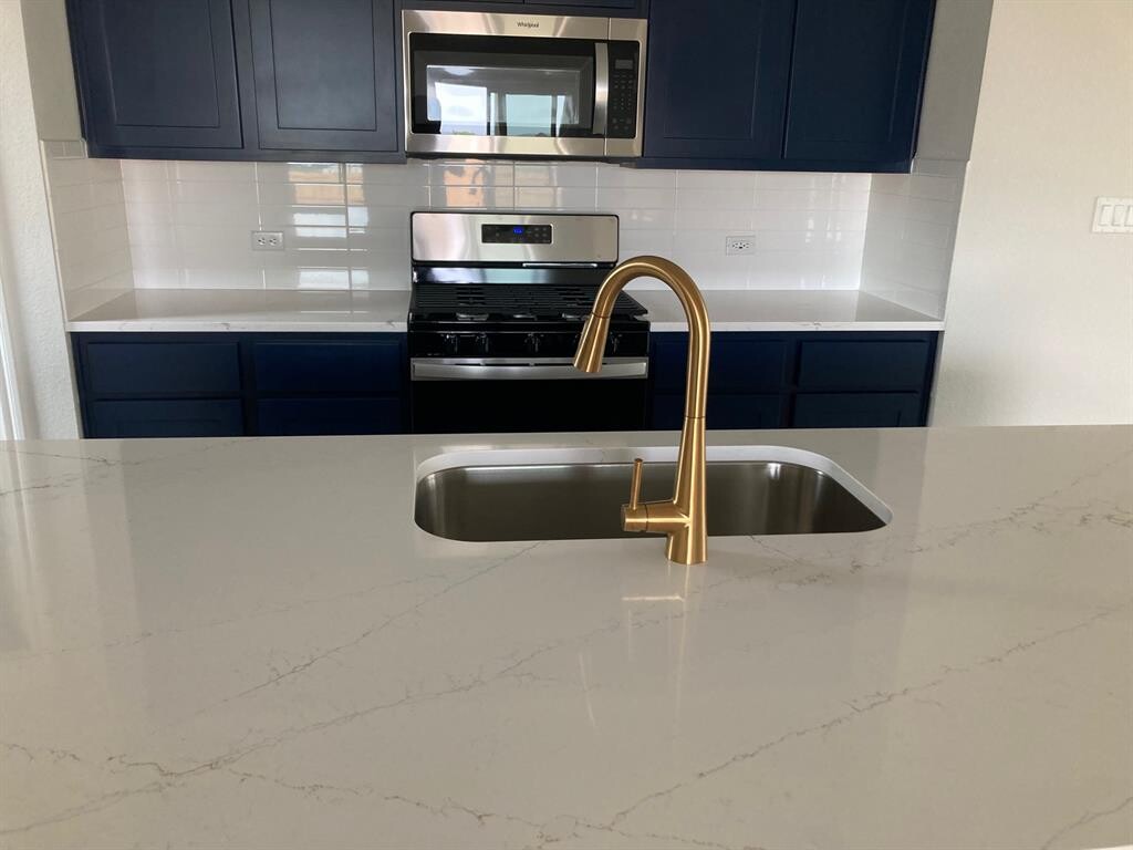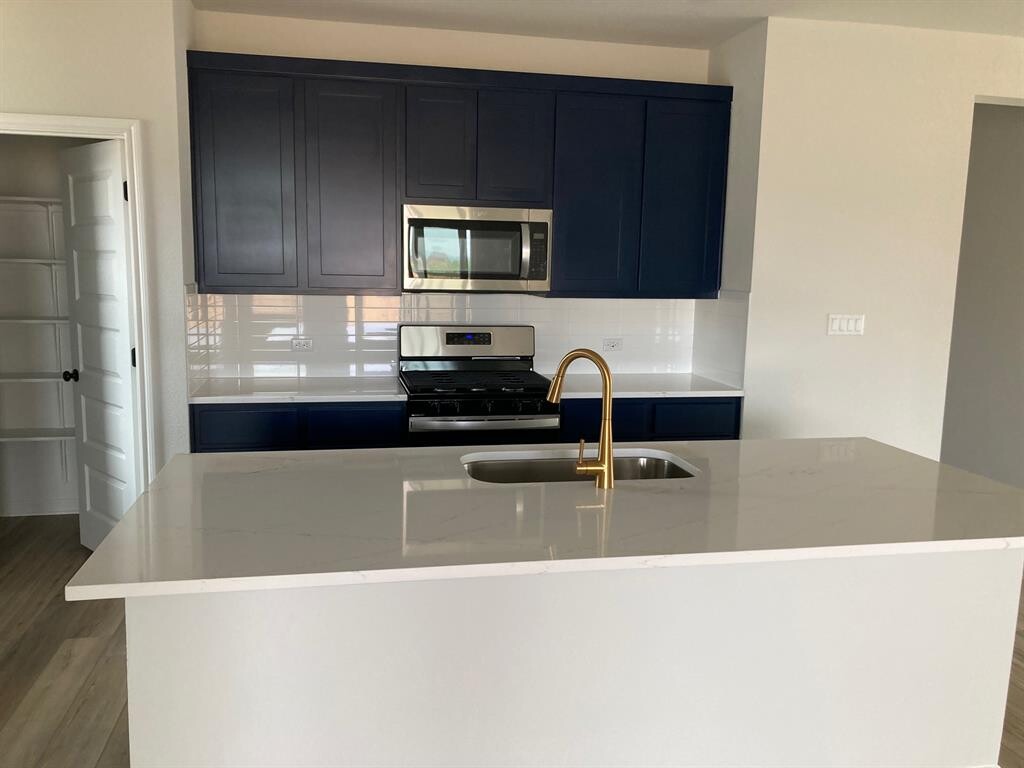 This 2024 built home in Avery Centre, Round Rock, offers comfortable living space and stylish features. The one-story Pinion model includes a spacious front porch leading to a long foyer, a dining area, living room, and a well-appointed kitchen with a large center island and walk-in pantry. The home features three secondary bedrooms, a full hall bathroom, mudroom, and a convenient laundry room. The lavish owner's suite, nestled in the back corner, boasts a walk-in closet and a deluxe bathroom with dual vanities, a tub, and a walk-in shower. Highlights include blue cabinets, quartz countertops, subway tile backsplash, stainless steel appliances with a gas range, wood-look luxury vinyl plank flooring, and double vanities in both bathrooms. Additional upgrades include a covered patio, upgraded front door, blinds on all windows, garage door opener, and a sprinkler system. The location offers easy access to amenities like Round Rock Outlet, Kalahari, Dell Diamond, Ikea, Costco, Seton Hospital, and Texas State University.