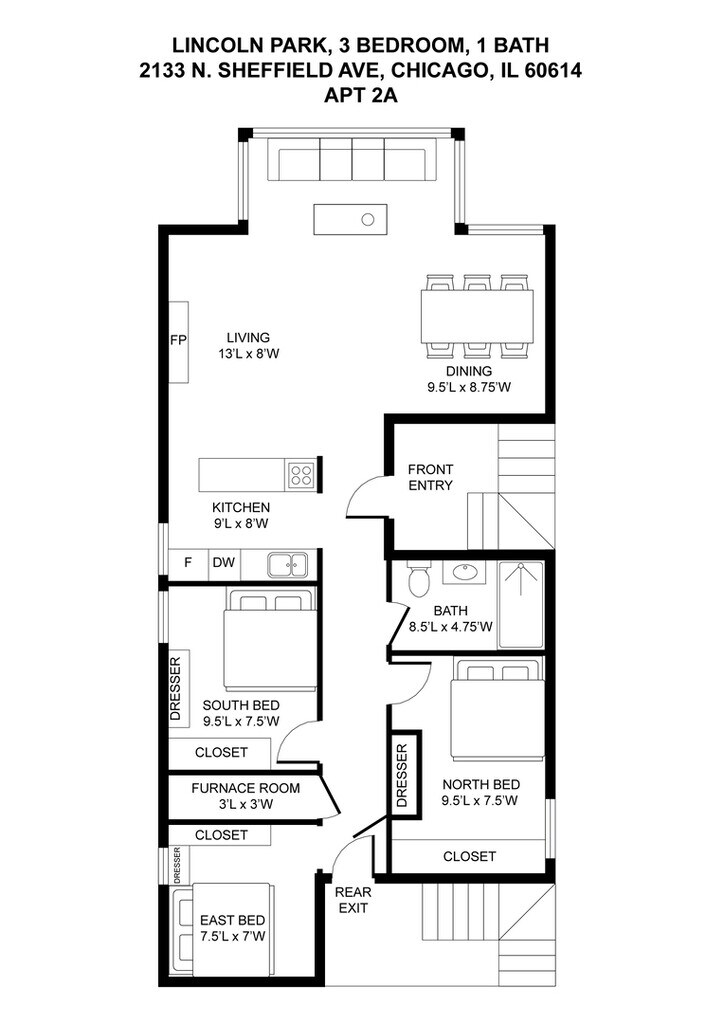 There is currently a 3 Bed 1 Bath Apartment for rent with 800 listed at 2133 N Sheffield Ave. It is Available Now.