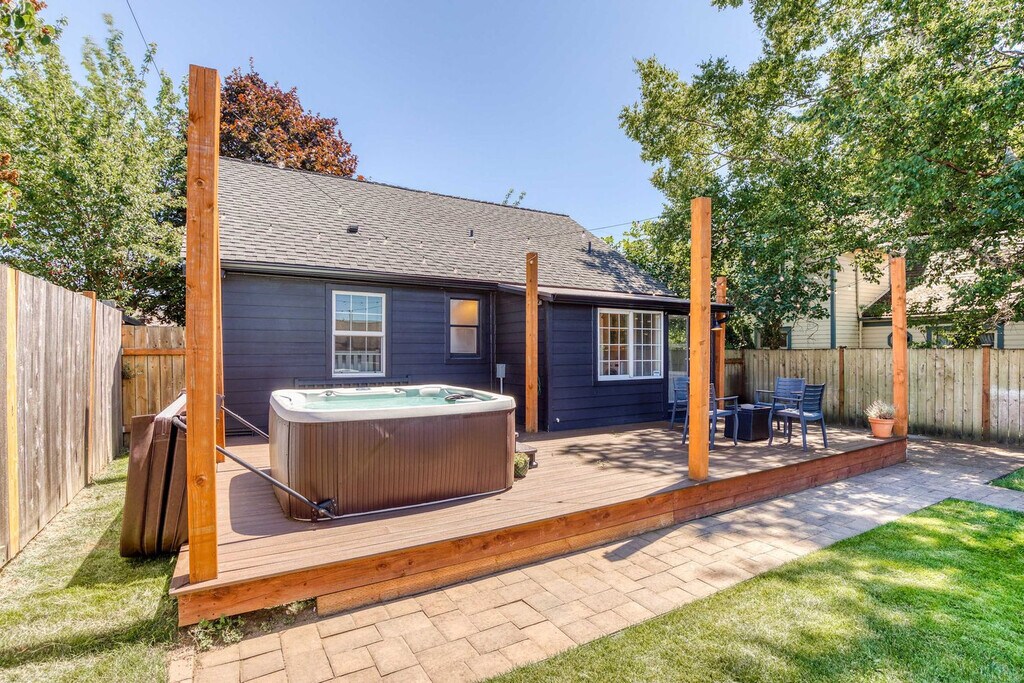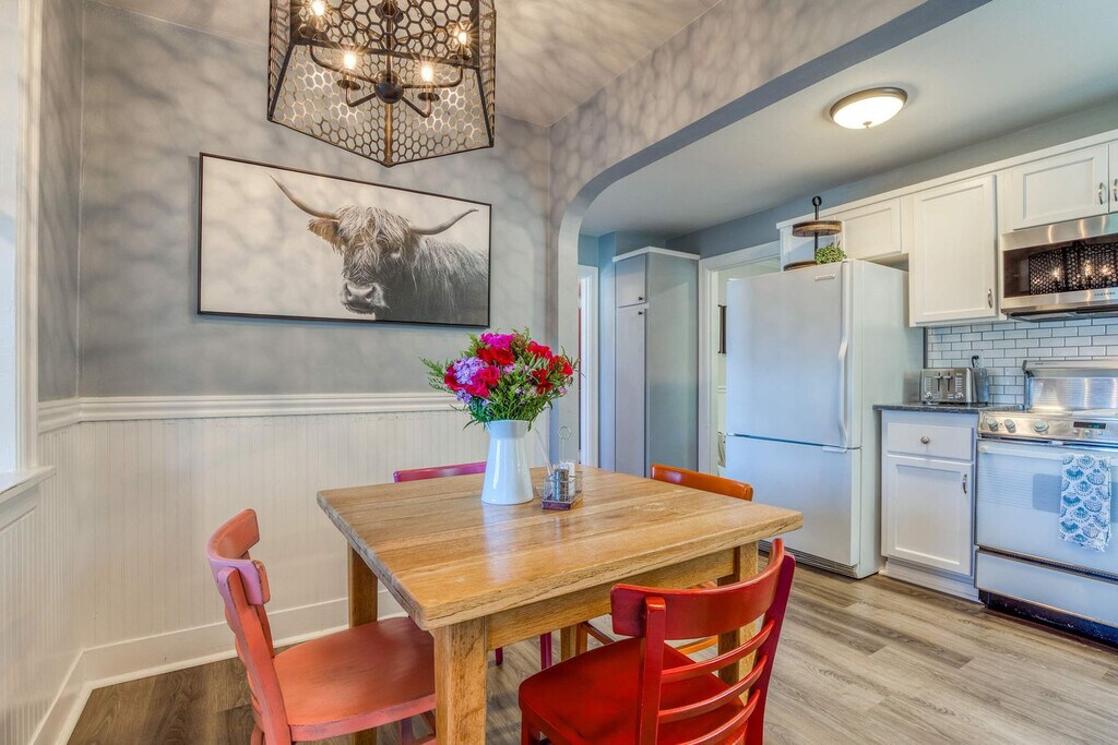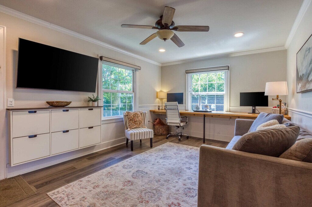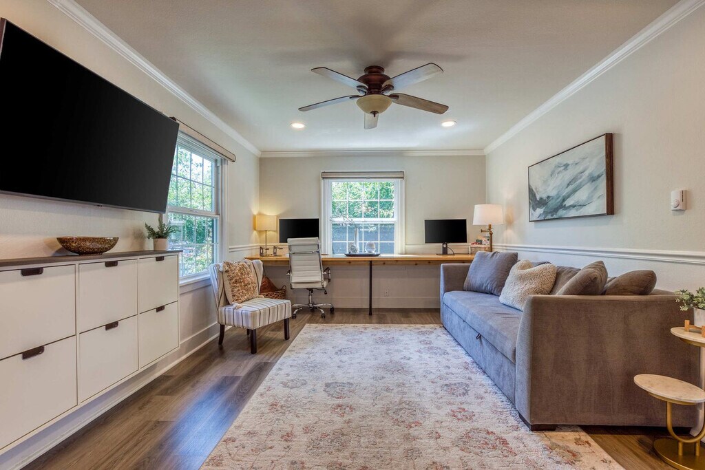 Feel at home in this centrally located 2-bedroom home. It has everything you need for a quick weekend away or for a long-term remote work stay. Each bedroom has a queen bed, and there is also a pull-out sofa for additional guests. The open kitchen and dining room have tons of natural light coming from the sun room. A smart TV in the living room connects to all the major streaming services. Walkable to historic First Street for coffee, restaurants, and shopping. Includes a double daylight co-working desk space in the living room.