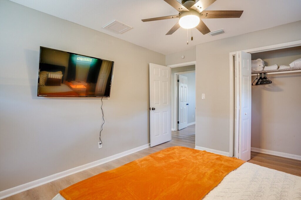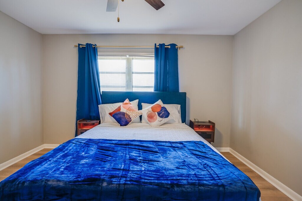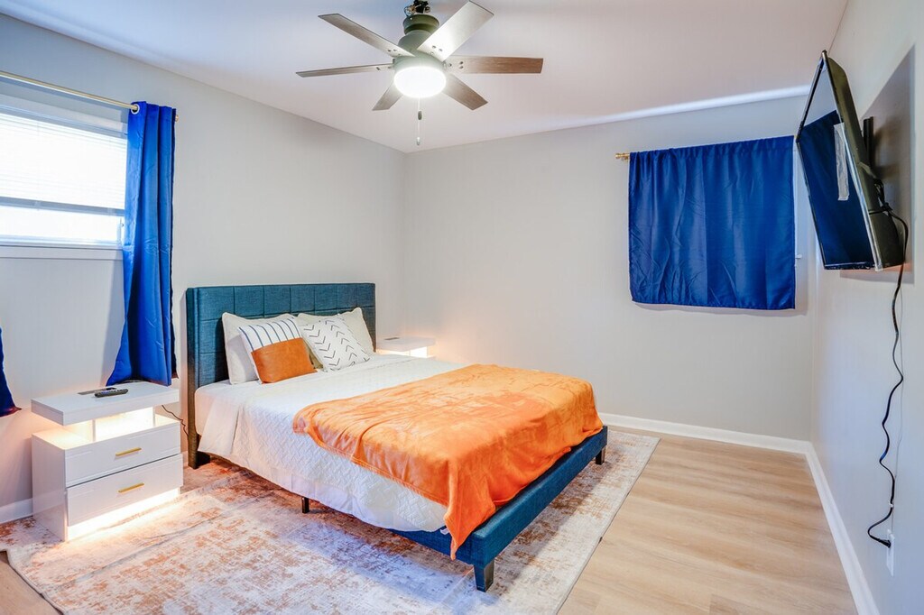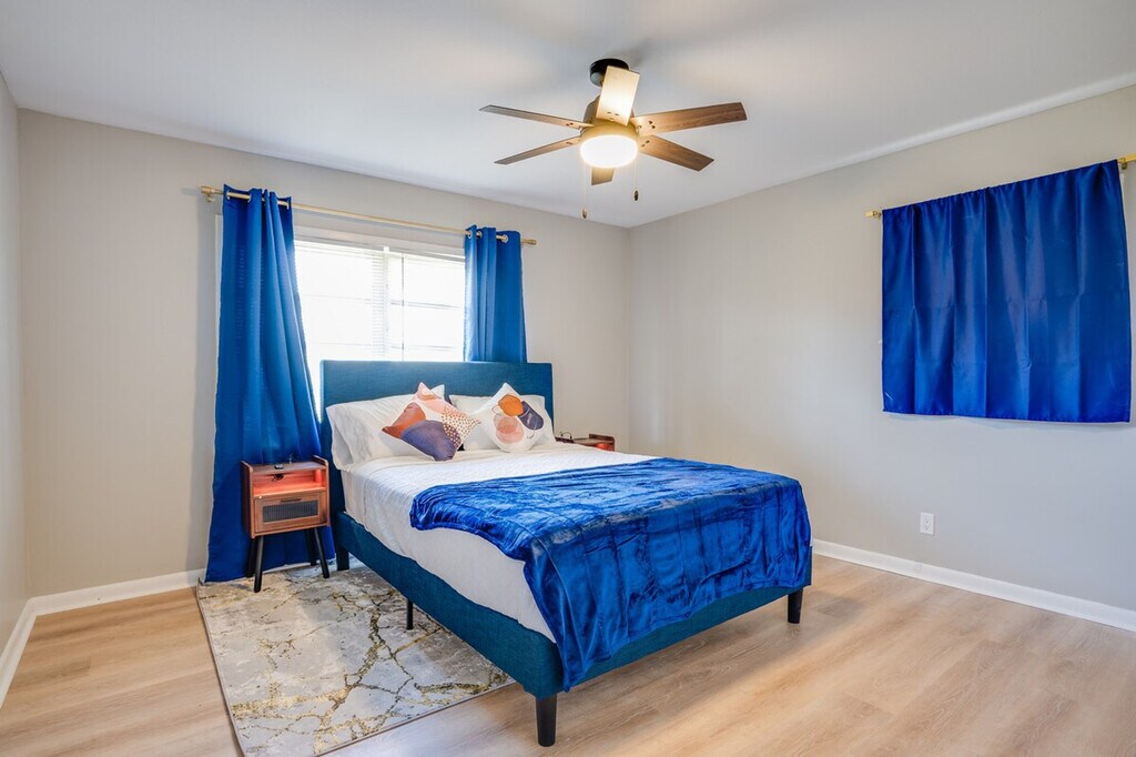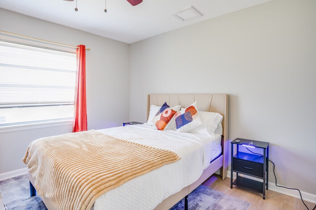 Feel at home in this recently renovated 5-bedroom, 2-bathroom home in Tallahassee, perfect for families, groups of friends, or business travelers. This spacious home features a full kitchen, free Wi-Fi, board games, books, free Netflix/Disney Plus/Hulu, a washer and dryer, and free Keurig coffee. Free parking is available on the driveway in front of the home, as well as the carport. The carport can fit 2 cars, and the driveway can fit up to 3 vehicles. Centrally located, this home is within a 5-minute drive of Florida State University and a 2-minute drive to many local restaurants and grocery stores, including Target and Publix. Downtown and Cascades Park are less than 10 minutes away. The neighborhood is quiet and surrounded by nature. The enormous backyard is fenced for privacy. Includes a desk for studying or remote work.