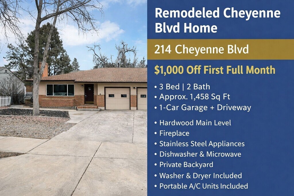 214 Cheyenne Blvd, Colorado Springs, CO 80905 Fully Remodeled Cheyenne Blvd Home with Private Yard | December & January Rent Free Available Immediately | 3 Bed | 2 Bath | 1-Car Garage | Approx. 1,458 Sq Ft Welcome to this thoughtfully remodeled 3-bedroom, 2-bath home located along Cheyenne Boulevard in southwest Colorado Springs. Originally updated with a full interior renovation completed in 2022 and freshly repainted on the exterior in summer 2024, this residence blends classic character with modern functionality throughout. The main level features hardwood flooring in a warm rustic beige tone, complemented by soft grey walls with crisp white trim and doors. The spacious living area offers a fireplace, ceiling fan, and a large picture window that fills the space with natural light. The galley-style kitchen is outfitted with stainless steel appliances, including a microwave and dishwasher—an uncommon upgrade for a home of this era—along with painted cabinetry creating a clean, three-tone design. A side door off the kitchen provides direct access to the private backyard. All three bedrooms are located on the main level and feature comfortable carpeting. Both bathrooms include tub/shower combinations, with one serving the primary bedroom. The basement offers generous storage space and houses the washer and dryer, which are included for tenant convenience. This home includes a private backyard space maintained by the tenant, along with exclusive use of the driveway and one-car garage. Portable A/C units are included. Please note this residence is part of a triplex, with the other units located on the opposite side of the building, allowing for added separation. Located near schools, parks, and major corridors, this property offers a convenient southwest Colorado Springs location with easy access to daily amenities. Incentive: $1,000 off the first full month’s rent. Rent: $2,000 per month Utilities: Tenant responsible Parking: 1-car garage + driveway Laundry: Washer & dryer included (basement) Don’t miss out on this fantastic property managed by Action Team Realty, proud to hold a 4.5-star Google rating. Schedule your showing today! Check out our Virtual Tour!! Lease length will be negotiated at the time of Application approval. Tenant is Responsible for All Utilities, including trash. No Pets and no smoking!! Contact Action Team Realty for a showing -- . Applications can be made at which is $65 per adult, and each person over the age of 18 must submit a separate application. The minimum credit score to apply for this unit is 700. Please review all other rental requirements to apply to the unit to be approved by Action Team Realty. 1. A prospective tenant has the right to provide to the landlord a portable tenant screening report, as defined in section 38-12-902(2.5), Colorado Revised Statutes; and 2. If a prospective tenant provides the landlord with a portable tenant screening report, the landlord is prohibited from: Charging the prospective tenant a rental application fee; or Charging the prospective tenant a fee for the landlord to access or use the portable tenant screening report. Please Check Our website for additional pictures and information. By submitting your information on this page you consent to being contacted by the Property Manager and RentEngine via SMS, phone, or email.