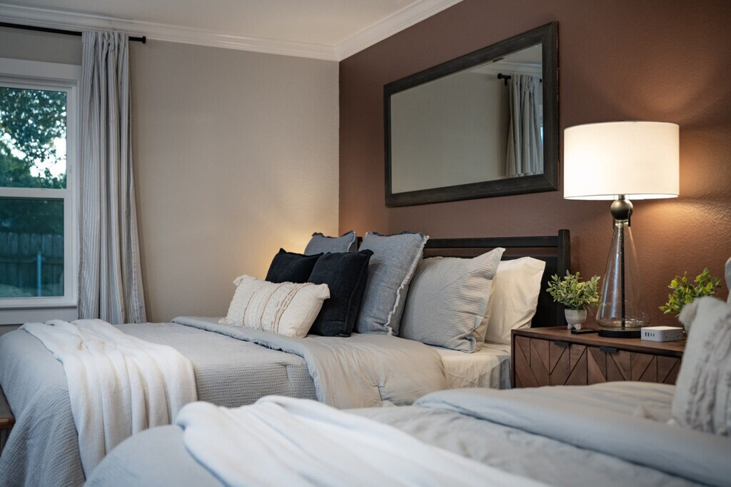 Welcome to Helena Haven, a beautifully remodeled single-story home offering the perfect blend of comfort, convenience, and style. With 4 bedrooms, 3 bathrooms, and 5 king-size beds, this retreat is designed to host families, groups, and game day gatherings alike. Located just 1 mile from Legends Event Center and Top Golf, 1.5 miles from Century Square dining and shopping, and 2.5 miles from Kyle Field and Texas A&M, this home is within walking distance to Farm Patch Market for fresh produce and the newly rebuilt Chicken Oil Co., a local favorite. Inside Helena Haven, relax in the living room after a day in Aggieland with a large sectional for 6, two ottomans, a 65” Smart TV, and board games for the whole group. Cook with ease in the fully stocked kitchen, complete with an eat-up bar for 3, a coffee bar with drip and pod options, and every appliance you need including a blender, toaster, crockpot, and wine glasses. Enjoy meals together around the 60” dining table with seating for 6. The primary suite features 2 king-size beds, an ensuite bath with double vanities and walk-in shower, patio access, a desk, and a 65” Smart TV. Additional bedrooms offer king-size beds, Smart TVs, and blackout curtains, with one providing an ensuite bath with a tub/shower combo. Additional sleeping options include a rollaway twin and a queen blowup mattress. The hallway bath is stocked with shampoo, conditioner, body wash, men’s essentials, facial cleanser, and makeup towels. The property offers a shaded patio and private fenced yard, a lighted pathway entry, and full laundry with washer/dryer, iron, ironing board, and steamer. Helena Haven is perfectly situated for those looking to explore Bryan-College Station. Walkable to local favorites like Farm Patch and Chicken Oil, and close to Texas A&M, Century Square, and Downtown Bryan nightlife, this home offers a spacious layout with 5 king-size beds, making it perfect for groups. Managed by locals who know Aggieland best, you can feel at home with fully stocked amenities so you can pack light. No smoking of any kind is allowed. Events require written approval and a $300 fee. Only registered guests are allowed unless approved in writing. Guest verification is required prior to check-in via a third-party provider. Quiet hours start at 9 PM. When leaving the home, ensure all lights, fans, and appliances are turned off. Use the plain black towels or black towels labeled "makeup" to remove makeup, not the white washcloths or towels. No tape, sticky substances, glitter, or anything that could damage the walls is permitted.