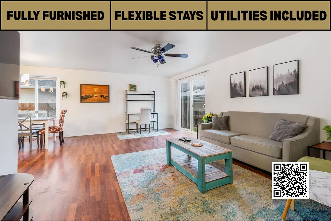 Ideal for a group of traveling nurses or eager college visitors, this single-story abode offers all the household essentials, welcoming modern decor, and easy access to all of Tacoma's local attractions! Indulge in the convenience of a fully furnished private home nestled in Tacoma, Washington. Benefit from close proximity to key locations, including major highways, medical centers, UW-Tacoma, the Convention Center, Tacoma Dome, the Museum of Glass, JBLM, and more. Experience the essence of home with 5R Suites – just bring yourself, and let us take care of the rest. Sleeping Layout: Bedroom 1: Queen BedBedroom 2: Queen BedBedroom 3: Full / Twin Bunk BedAdditional Sleeping: Deluxe Air Mattress Inclusions:A fully equipped kitchen stocked with plates, glassware, silverware, pots, pans, and more.An in-home washer and dryer ensure added convenience.Stay entertained with a Smart TV.Seamless work-from-home with fast WiFi, ensuring uninterrupted amenities such as coffee, tea, paper towels, laundry and dishwasher pods, toilet paper, bath towels (2 per guest), soap, shampoo, and conditioner are provided as starter packs.Pet enthusiasts rejoice – we're pet-friendly (*fee applies – refer below).Secure, convenient parking in the attached garage. Please Take Note:NO air conditioning - Fans will be provided.If you're accompanied by furry family members, a $25/night fee (for stays up to 10 days) or a $250 flat rate fee (for stays exceeding 10 days) applies per pet, with a maximum of 2 pets.Check-in: 4PM | Check-out: 11AM. Early check-in and late check-out are available upon request. (*Subject to availability and cleaning schedule - a $25/hour fee applies.) Kindly inquire in advance.Trash and recycling collection takes place every other Tuesday. To ensure your convenience, we will notify you through email. In the event of a missed trash or recycling pickup, a $50 fee will be applied to cover the cost of arranging an extra collection.To ensure a smooth departure, please leave key fobs, parking remotes, and mail keys where found at check-in. A photo will be required at check-out for key verification. Lost key fobs, parking remotes, or mail keys will be charged at $100 each.Booking requires ID verification and adherence to the rental agreement. **Your safety matters. This property features 2 exterior security cameras, above the front door and sliding glass rear door, all facing outward. They do not look into interior spaces**