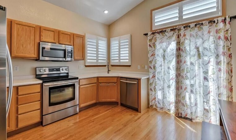 Welcome to this east-facing conveniently located house for your lifestyle. This house has 3 bedrooms, 2.5 bathrooms. It has a functional finished basement. The owner has paid off the solar lease, so you have free solar already installed saving money for you every month. You'll be immediately attracted by the curb appeal, telling you the owner loves and maintains this home with pride. So many things to boast about from the outdoor, to say a few, trex decks with bow belly railings and a custom made pergola. The indoor, this home has specific open floorplan, new Anderson windows and doors covered by plantation shutters, hardwood flooring, elfa shelving everywhere, tons of storage include two cedar lined closets, finished garage. So many details have been considered by the owner in this home. If you are looking for a turn key home with the confidence of prior maintenance, then this is the perfect home for you. This home is unfurnished, move in ready. It's in Adams-Arapahoe 28J school district that you can have lots of schools to choose from for your children. Come and view the property. Owner pays for HOA. Tenants responsible for all other utilities, snow removal for driveway and sidewalk, and renter policy insurance. Non-smokers.