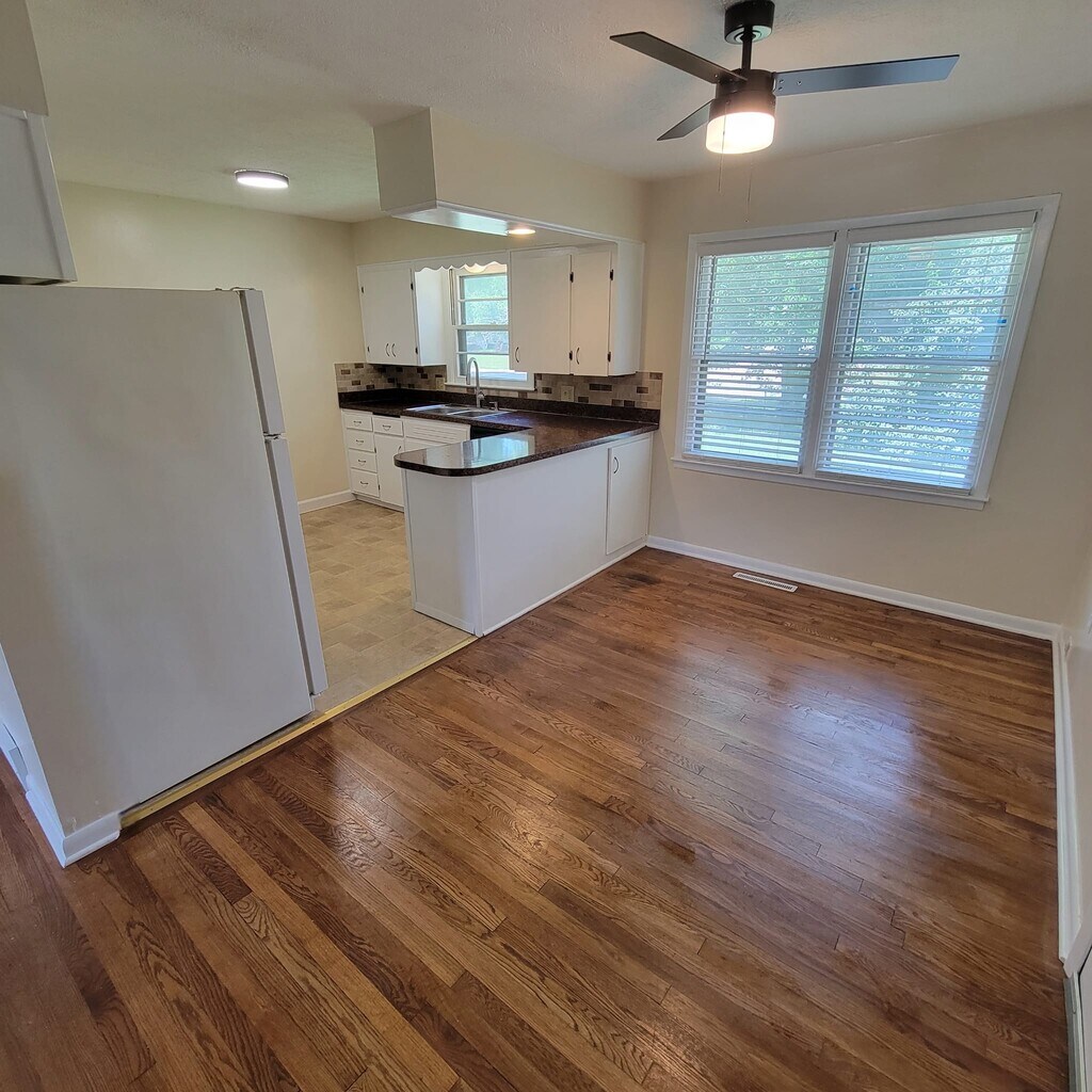 Beautifully renovated three bed 1 bath with a garage and fenced backyard! Spacious family room with a fireplace and a dining room big enough for the whole crew. This lovely home is right on the Lawrence bus route, and a short walk from Dillon's and all the family needs. The location is also close to the University of Kansas Campus, which is just 10 - 15 minutes away.