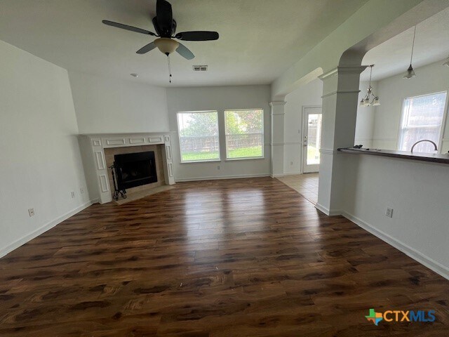 Welcome to this charming two story home featuring 3 bedrooms and 2.5 bathrooms. As you enter,you will be greeted by a formal dining area to the right,perfect for entertaining or everyday meals. The upstairs living area and bedrooms are adorned with solid oak flooring,while the kitchen and bathrooms offer durable tile flooring. The main living room downstairs features laminate flooring. Ceiling fans are installed throughout the home,providing added comfort and energy efficiency year round. The open concept living room is anchored by a cozy fireplace and flows seamlessly into the kitchen,which boasts stainless steel appliances,and an eat in dining area. Upstairs,the primary suite includes a private bath with a double vanity,a garden tub,and a walk in shower for added comfort and functionality. The backyard features a covered patio,offering a shaded retreat. Pets considered on a case-by-case basis.