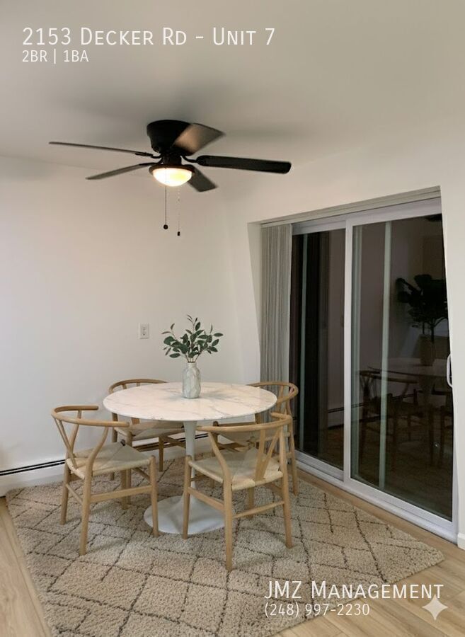 Welcome to Z on Decker Apartments, conveniently located in Walled Lake. This COMPLETELY updated apartment offers approximately 1,000 square feet of comfortable living space. This unit is a 2 BR unit on the 2nd floor, so nobody is above you, and it has been fully renovated, featuring new luxury vinyl plank flooring and an updated kitchen with white shaker cabinets, quartz countertops, and stainless steel appliances, including a dishwasher. The bathroom has been completely redesigned, featuring a fully tiled stand-up shower with sleek Euro glass doors and a modern vanity. The apartment is freshly painted throughout for a clean, move-in-ready feel with recessed lighting to complete a modern, bright look. Your own private balcony with a new trex deck to enjoy those summer nights. Residents enjoy private storage units, large shared backyards, and brand-new coin-operated laundry machines in every basement. Located within the award-winning Walled Lake School District, this community offers both comfort and convenience. Cats are welcome—please inquire about applicable pet fees. Z on Decker is nestled just minutes from downtown Walled Lake in the heart of Commerce Township, surrounded by lakes and close to major highways (M-5, I-696, I-275, and I-96), Walled Lake Central, and Twelve Oaks Mall—making commuting, shopping, and entertainment easy. NO SHOWINGS UNTIL ON OR BEFORE 6/1/2026. PLEASE VISIT OUR WEBSITE AT TO APPLY OR FIND ADDITIONAL INFORMATION.