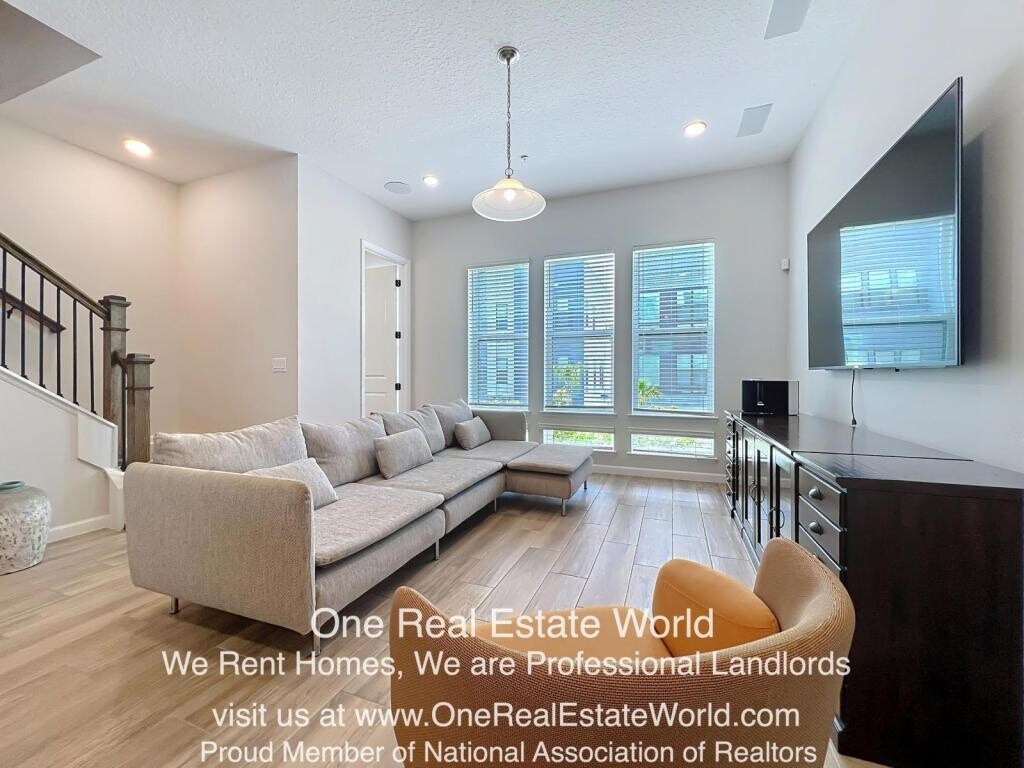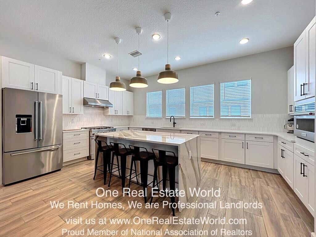 The Brix at The Packing District! This exceptional 4-story luxury townhome offers 4 bedrooms, 3.5 bathrooms, a private rooftop terrace with panoramic views, a custom-built brick summer kitchen-perfect for entertaining. Available now and move-in ready. Situated at the center of the community courtyard, this newly constructed residence showcases high-end finishes, including wood flooring throughout the bedrooms and stairs, iron rod stair railings, custom window blinds, and blackout curtains in the primary suite. The first floor includes a private room, closet, and full bathroom-ideal as a home office, yoga/fitness room, or in-law suite. The second floor features a gourmet kitchen with gas stove, stainless steel appliances, cabinetry and pantry, family room with guest bathroom. On the third floor, you\'ll find the spacious primary suite with a private en-suite bath, two additional bedrooms, a full secondary bath, and a conveniently located laundry room. A two-car garage with additional storage space adds practicality to this luxury home. Two EV connectors inside, one on each side of the garage. Enjoy low-maintenance living with access to premium community amenities: a dog park, children\'s play area, Foxtail Coffee, Great Southern Box Food Hall, 4Roots Farm, 1.5-mile walking and biking trail, green recreational areas, the amphitheater, the Orlando Tennis Centre, and the YMCA-all just steps away. These additional charges may apply: 1) One-Time Administration Fee : 99.00 one time ((Move In) One-Time Administration) 2) Rental Contract Draft : 145.00 one time ((Move In) Rental Contract Draft ) 3) Online Access Portal (Paid Yearly) : 49.00/yr (Online Access Portal (Paid Yearly) )