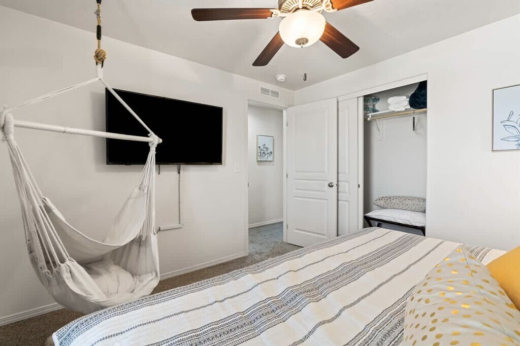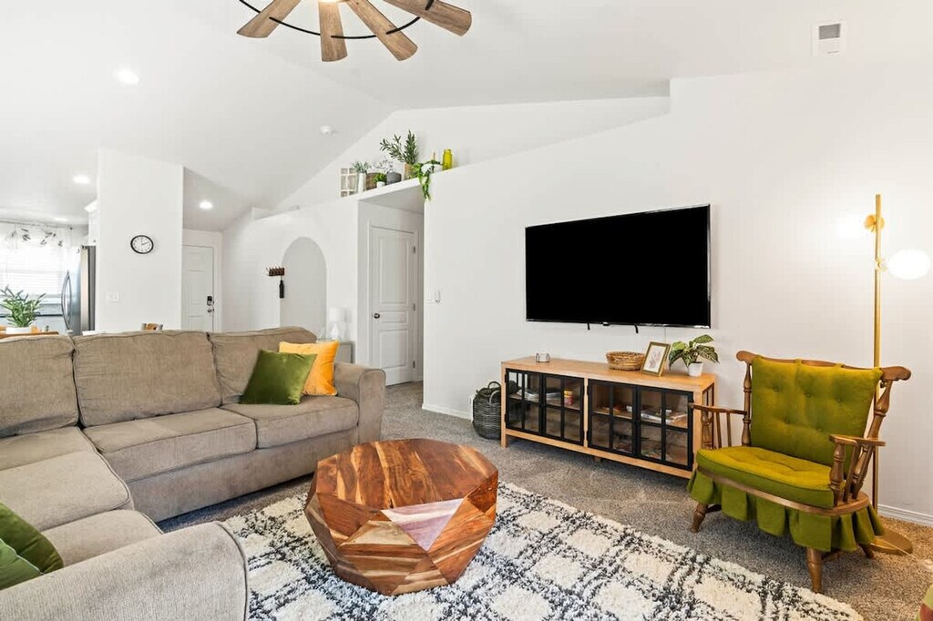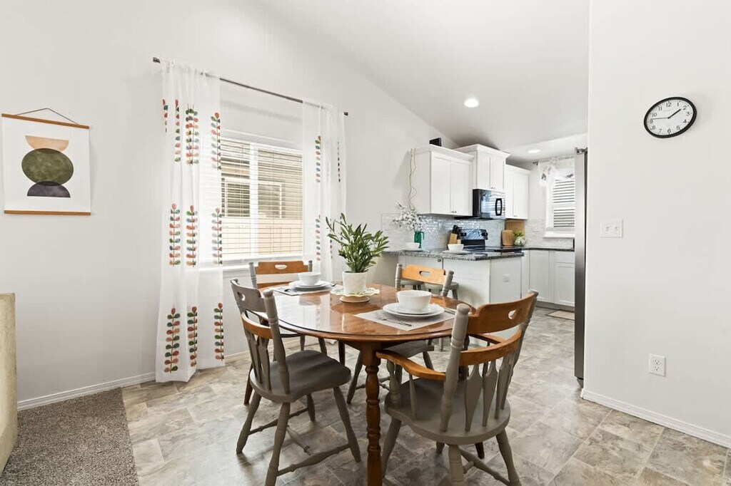 Feel at home in this retro-inspired home that sleeps up to 10. It's centrally located in Caldwell, right off of Hwy 26, and close to the College of Idaho. This home is professionally cleaned and maintained. Outdoor and garage amenities, including BBQ grills, hot tubs, saunas, and recreational or storage items, are offered as a courtesy and are considered self-maintained. While the host does their best to prepare these areas, they are exposed to weather and natural elements and may not always be in working condition during your stay. Well-behaved pets are allowed with prior approval and a fee of $50 per stay. The home is 2 minutes to the freeway and 10 minutes to major shopping. From Freeway exit 29, take a right onto Chinden/Hwy 26, then a left onto Aviation, a right onto Nantucket, and a left on Cliff Swallow. The house will be on the right. Parties, events, and unauthorized gatherings are strictly prohibited and may result in immediate termination of the reservation without a refund and an additional cleaning or disturbance fee. Smoking (including vaping and cannabis) inside the home will result in a $250 cleaning fee. Only guests included in the reservation are permitted on the property unless approved in advance; additional unregistered guests may incur a $100 per person per night fee. Quiet hours are from 10:00 PM to 8:00 AM; please respect the neighbors by keeping noise to a minimum during these hours. Late check-outs beyond 30 minutes without prior approval will incur a $300 fee. Check-in is at 4:00 PM and check-out is at 11:00 AM. Tampering with security devices is strictly prohibited and will result in cancellation without refund. [SI]