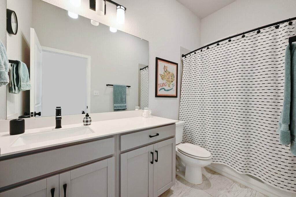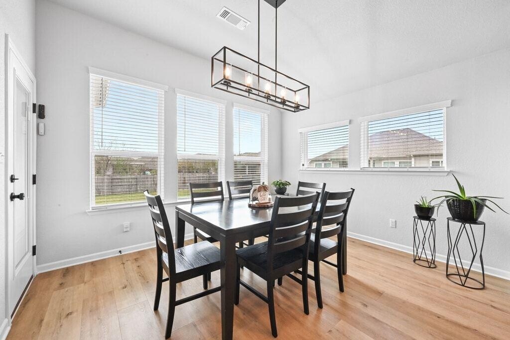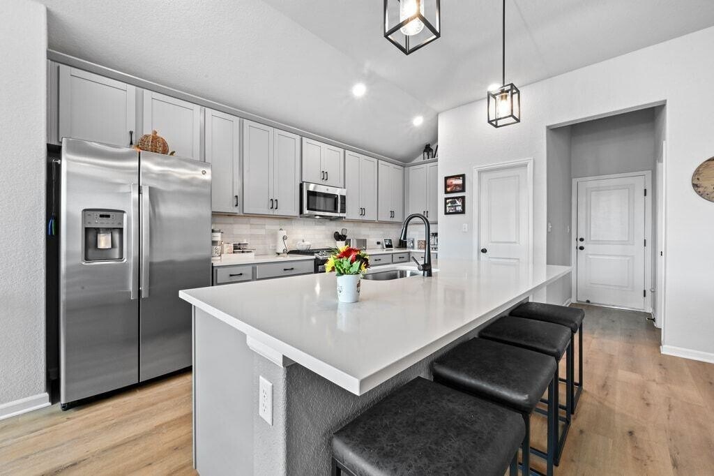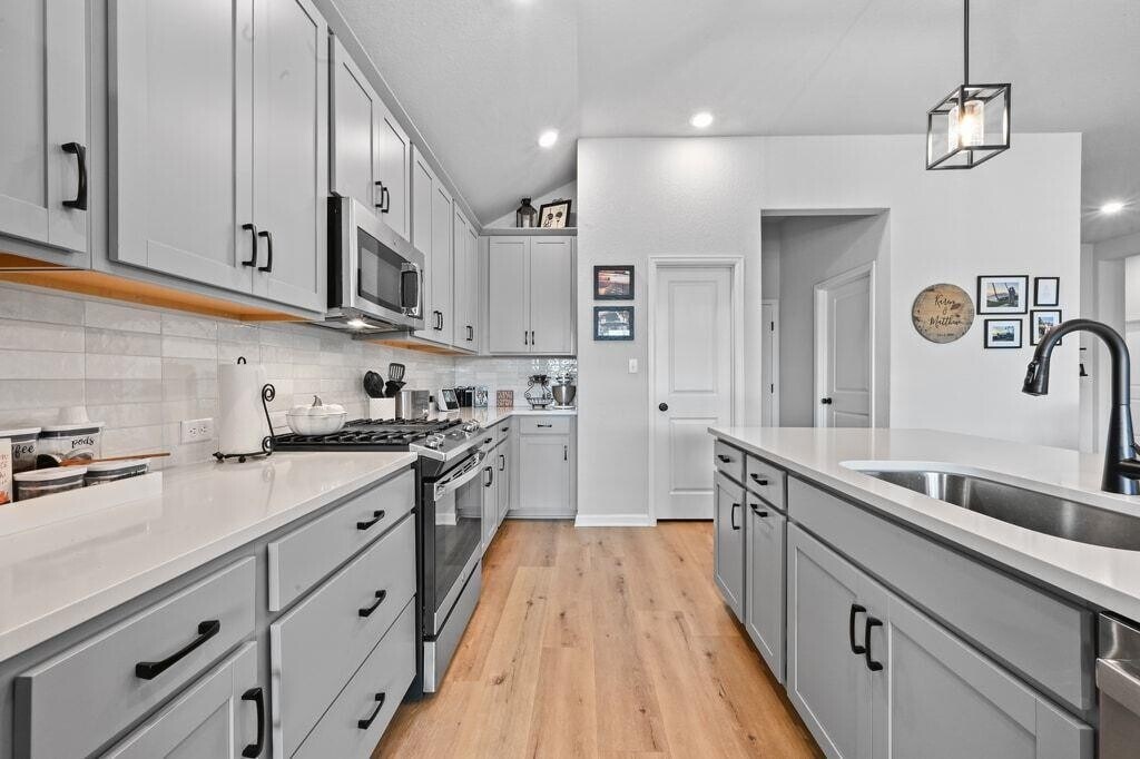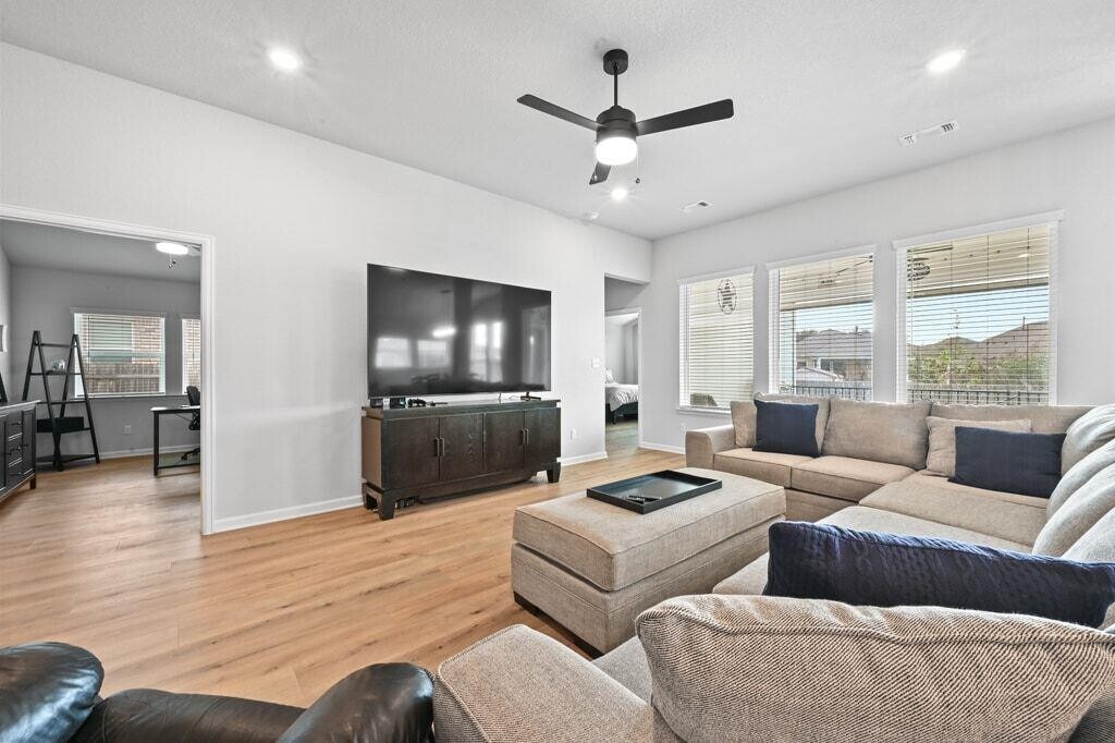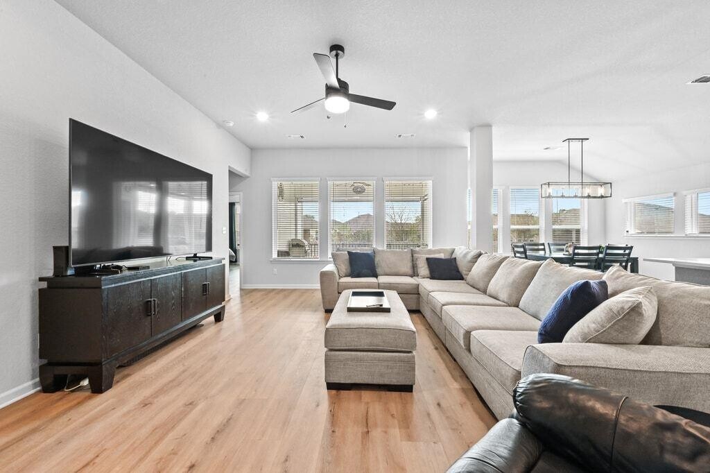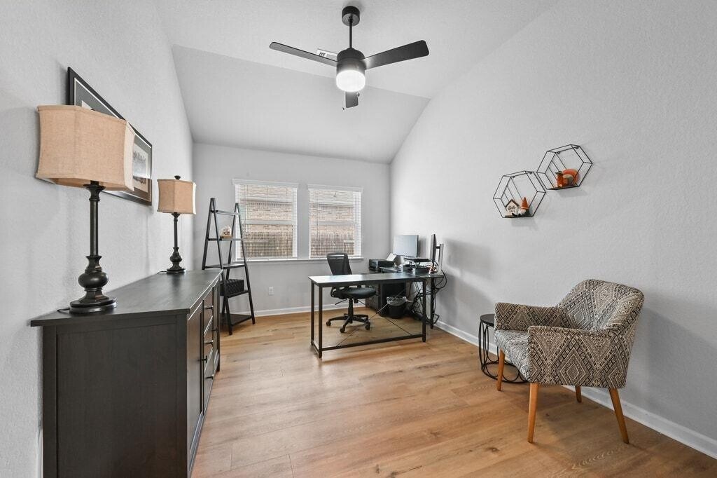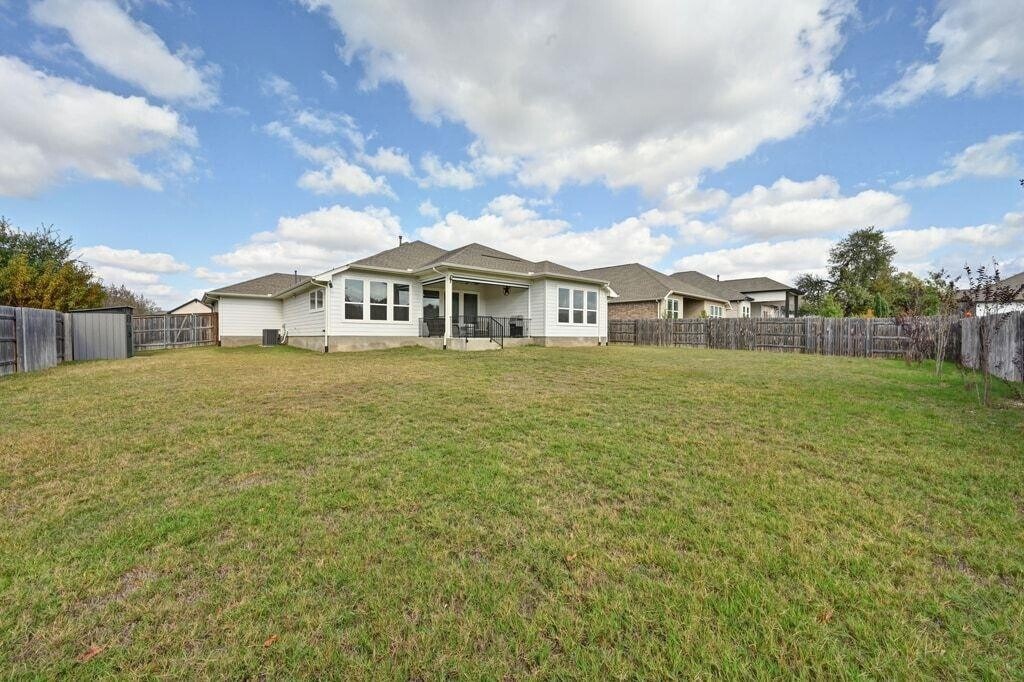 Experience refined living in this never-before-leased, beautifully appointed residence—only three years old and distinguished by thoughtful upgrades and meticulous care. Bathed in natural light from energy-efficient windows, the Kellywood floor plan offers an elevated open-concept design centered around a showpiece kitchen. Gray cabinetry, gleaming white quartz countertops, an oversized gathering island, and upgraded designer lighting create a space that is as stunning as it is functional. The versatile study provides a sophisticated escape and can serve as a private office, stylish media lounge, or game room. The Owner’s Retreat is a serene haven, featuring an oversized walk-in shower and a layout designed for daily indulgence. Two additional front bedrooms enjoy excellent separation, offering comfort, privacy, and individualized style. A rare 3-car garage adds exceptional convenience. Outdoor living is equally impressive. A large covered patio with cooling ceiling fan opens to a sprawling backyard, offering endless opportunities for entertaining, relaxation, and play. Located in the sought-after Cypress Forest community, residents enjoy amenities including a sparkling pool, fishing pond, scenic trails, and peaceful green spaces. All of this just minutes from Downtown Kyle’s Market Days, parks, dining, and recreation—and a short drive to HEB, Target, San Marcos, and Austin. Live beautifully in a home that blends modern luxury with everyday comfort.