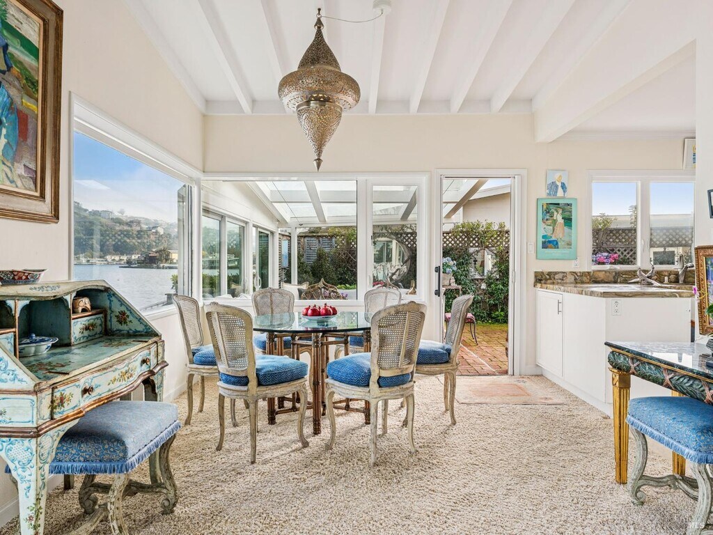 Spectacular single-level waterfront retreat on the Belvedere Lagoon offering exceptional outdoor living and picturesque water views. The living room features a gas fireplace, built-in shelves, floor-to-ceiling windows framing incredible views of the lagoon, and access to the outdoors. The kitchen features limestone floors, white cabinetry, stainless steel appliances, and French doors opening to an inviting patio. The adjacent dining area features oversized windows framing beautiful water views and opens to a covered indoor-outdoor terrace with a glass roof and sliding doors. The primary suite features carpeting, a skylight, French doors opening to the outdoors, and a full bathroom. Two comfortable guest bedrooms and a full bath with a stall shower. The private backyard features multiple brick patios ideal for lounging and entertaining, a covered terrace, a sunny dock, and picturesque views of the lagoon and the rolling hills of Tiburon. Ideal location close to Belvedere Park and the San Francisco Yacht Club, minutes to the Old Rail Trail waterfront pathway, and a few blocks to downtown Tiburon's Main Street with San Francisco and Angel Island ferry service, waterfront restaurants, and trendy shops. Furnished rental. Available March 15 - July 30 and Sept - December. MLS#326017653