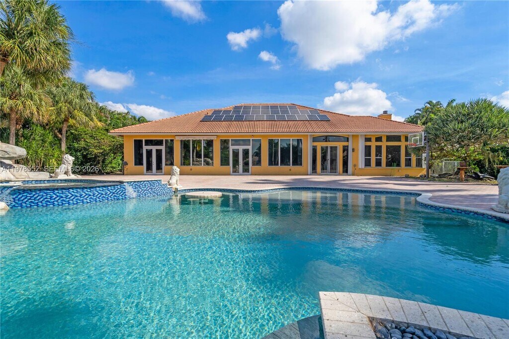 Beautiful waterfront estate in the prestigious gated community of Emerald Springs Estates. Huge open great room floor plan. 7 rooms in total, 5 large bedrooms (all 5 suites), plus two dens that can be utilized as offices or maids quarter, 6 bathrooms, formal living room, family room, also a large Florida room, gas range, stainless steel appliances, wood burning fireplace. Entire rear of house is glassed for ultimate view of the infinity pool (heated), rock water falls and spa, lake front, whole house generator, solar panels, extended 3 car garage, most of the home is impact glass with some rolladen shutters in some areas (minimal), full alarm system installed with built in camera system, speakers throughout great room, patio and pool area, and lush landscaping. Pool and lawn maintenance are included in the price. Available for 6-12 month lease with option to renew long term. MLS # A11978552