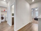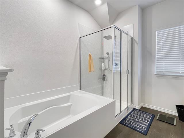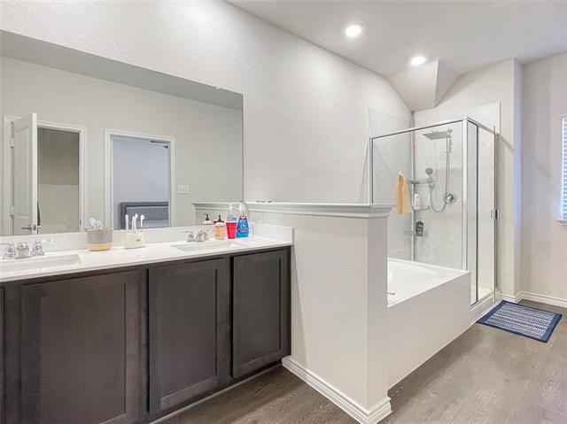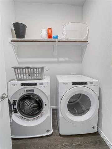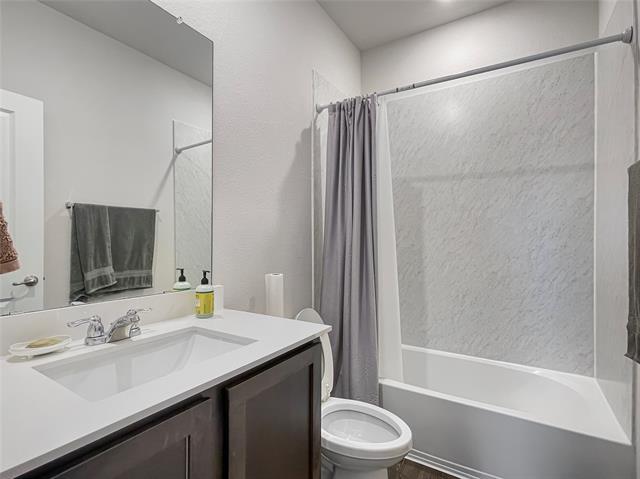 Like new townhome features 3 bedroom, 2.5 baths. Large primary bedroom with en-suite bath with large garden tub and tile shower and dual sinks. Generously sized secondary bedrooms with carpet and large closets, bathroom and laundry upstairs. Downstairs the open floorplan living room with luxury vinyl plank floors opens to the kitchen. The gourment kithcen has stainless steel appliances, gas range, quartz countertops, built in microwave, disposal, dishwasher with lots of cabinets, refrigerator,. washer, and dryer are provided. Rear entry 2 car garage has epoxy floors. This unit is immaculate and gently cared for. Walk to Community Pool, Mesquite Rodeo, convenient to 635, shopping, and restaurants and short drive to Downtown Dallas.