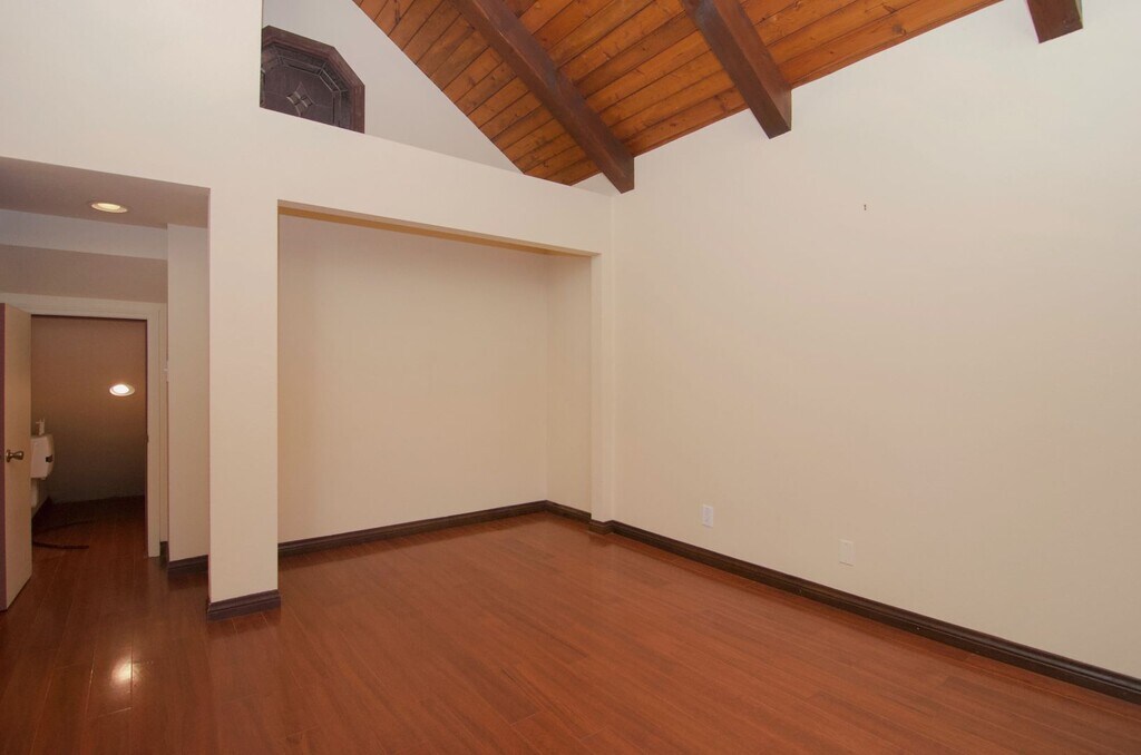 Brimming with charm and character, this stunning Craftsman-style home captivates with wood-beamed, cathedral-vaulted ceilings and a grand brick fireplace that anchors the open living space. Vaulted ceilings throughout enhance the airy, expansive feel of the thoughtfully designed floor plan. The kitchen seamlessly opens to the living room and features granite countertops, stainless steel appliances—including refrigerator—recessed lighting, large windows, and a breakfast bar with included barstools, perfect for everyday living and entertaining. The ground-level primary suite is a true retreat, showcasing wood-beamed vaulted ceilings, French doors that open to the backyard, and a beautifully remodeled en-suite bath with dual sinks and a travertine tile shower. Upstairs, an additional bedroom offers flexibility as a guest room or ideal home office. Outdoor living is abundant with multiple private spaces, including a gated front courtyard with lush lawn leading to the front entry, and a spacious backyard featuring a grassy lawn and patio—perfect for relaxing or hosting gatherings. Additional highlights include a two-car garage and an indoor laundry room. A rare combination of character, comfort, and convenience—this home truly has it all. +Pets considered with pet deposit
