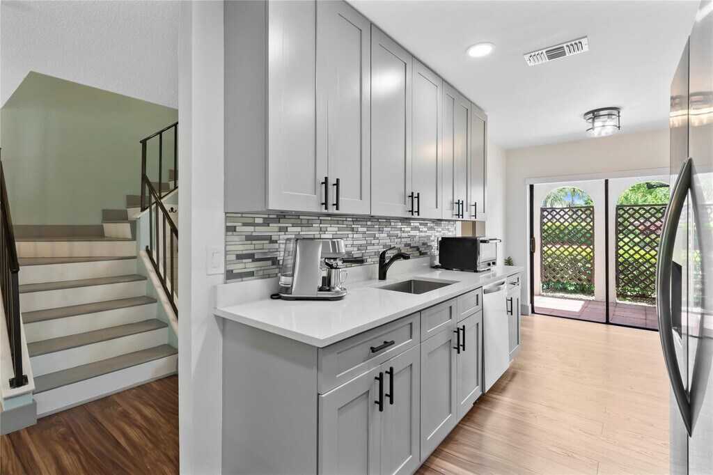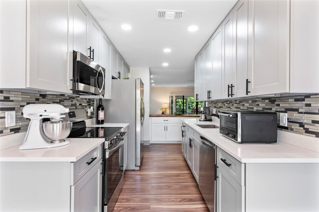 Stunning 2/2.5 Condo in Gated Boca Lago Community All Ages Welcome! This fully renovated first-floor condo offers modern living in a peaceful,golf course community. Located in the desirable Boca Lago,this home features a beautifully updated interior with shaker kitchen cabinets,quartz countertops,and sleek stainless steel appliances. Both full bathrooms have been tastefully remodeled with new tile in the showers,glass shower doors,new vanities,lighting,and fixtures. The spacious primary bedroom boasts a generous walk-in closet for ample storage. Enjoy the convenience of a full-size washer and dryer,plus a serene private patio perfect for relaxing. Situated in a quiet golf course community,membership is optional. Dont miss the chance to own this move-in-ready home! MLS ID F10490394