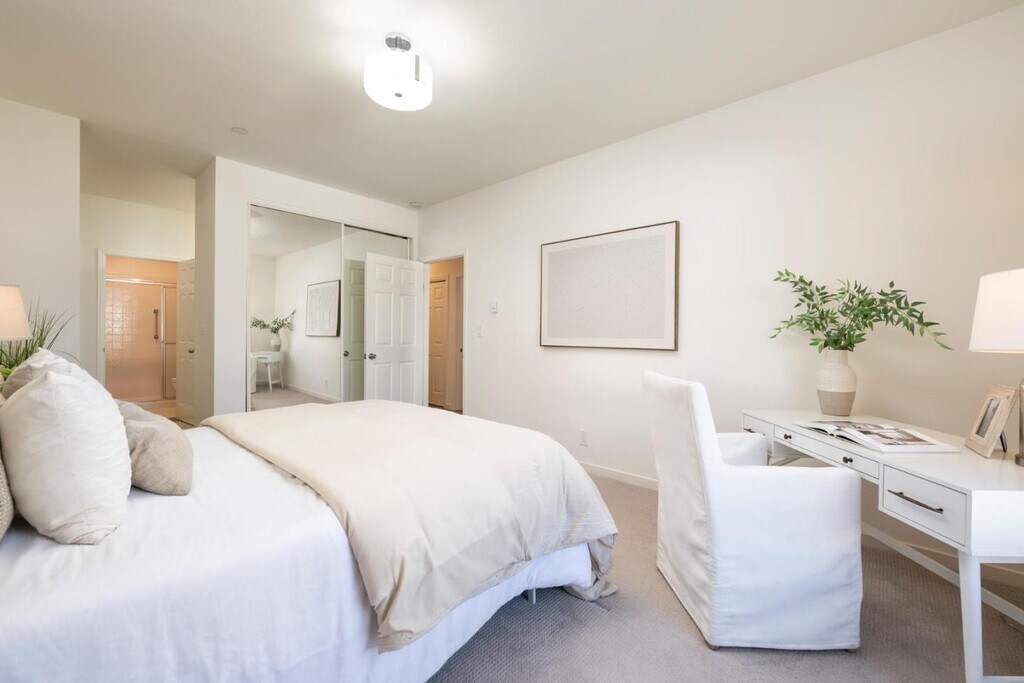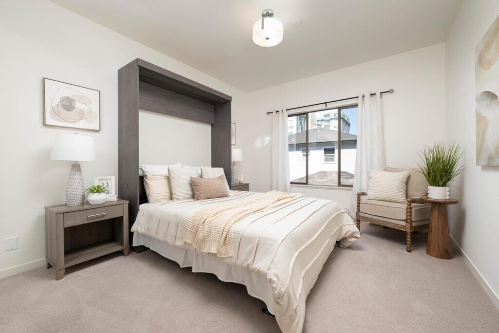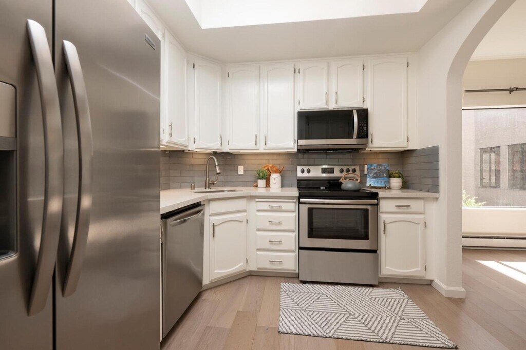 Available Now! Live where everything is just steps away. Enjoy walkable urban living in the heart of downtown with Central Park across the street, perfect for a morning walk or evening stroll, and cafes, dining, shopping, fitness, and entertainment right outside your door. This well positioned two bedroom, two bath residence offers single level living with no stairs and a thoughtfully designed layout. The beautifully updated kitchen features stainless steel appliances, white cabinetry, quartz countertops, and a designer tile backsplash, flowing into the dining area through a charming archway. The inviting living room offers built in shelving, mirrored accents that reflect natural light, and a cozy fireplace. Sliding doors open to a covered balcony that is perfect for morning coffee or relaxing in the evening. Enjoy a spacious primary suite, in unit laundry, and generous storage throughout. Located in a well maintained building, residents enjoy a furnished rooftop deck with barbecue and downtown views, secure two car parking, storage, ButterflyMX entry system, elevator access, and trash chutes. Water and garbage are included. Convenient location near Caltrain, major employers, and SFO approximately ten minutes away, making commuting easy. MLS # ML82037387