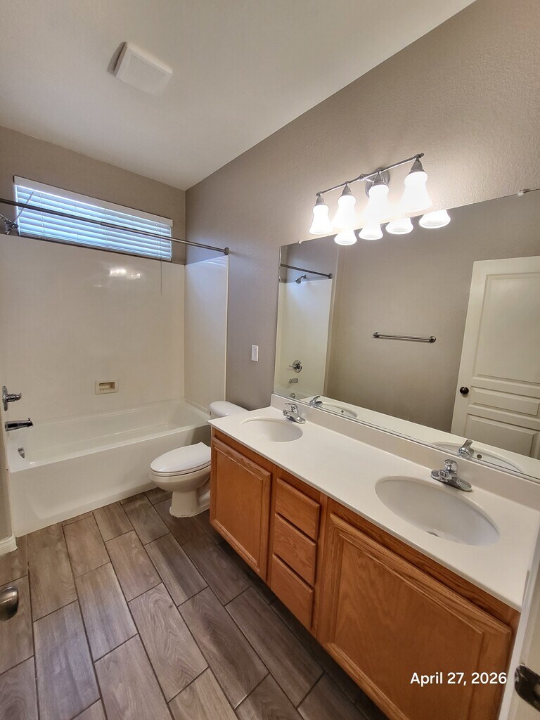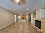 Beautiful single-story home featuring 3 bedrooms, 2 bathrooms, and a 2-car garage in a desirable gated community. Spacious open floor plan with upgraded wood-look flooring throughout main living areas and bedrooms. Large kitchen offers granite countertops, center island, breakfast bar, ample cabinetry, and opens to the expansive family room with cozy fireplace—perfect for entertaining. Separate living and dining area adds flexibility. Oversized primary suite includes a walk-in closet and spa-like bath with dual sinks, soaking tub, and separate shower. Generously sized secondary bedrooms. Low-maintenance desert landscaping in front and back with covered patio. Conveniently located near parks, shopping, dining, and freeway access. Move-in ready!