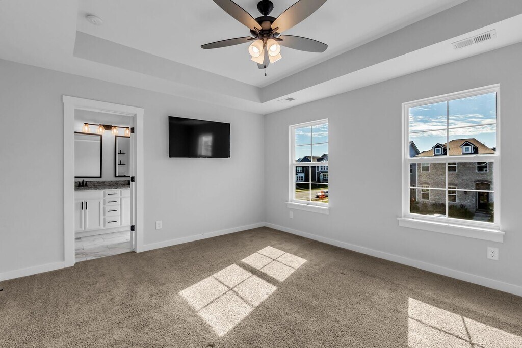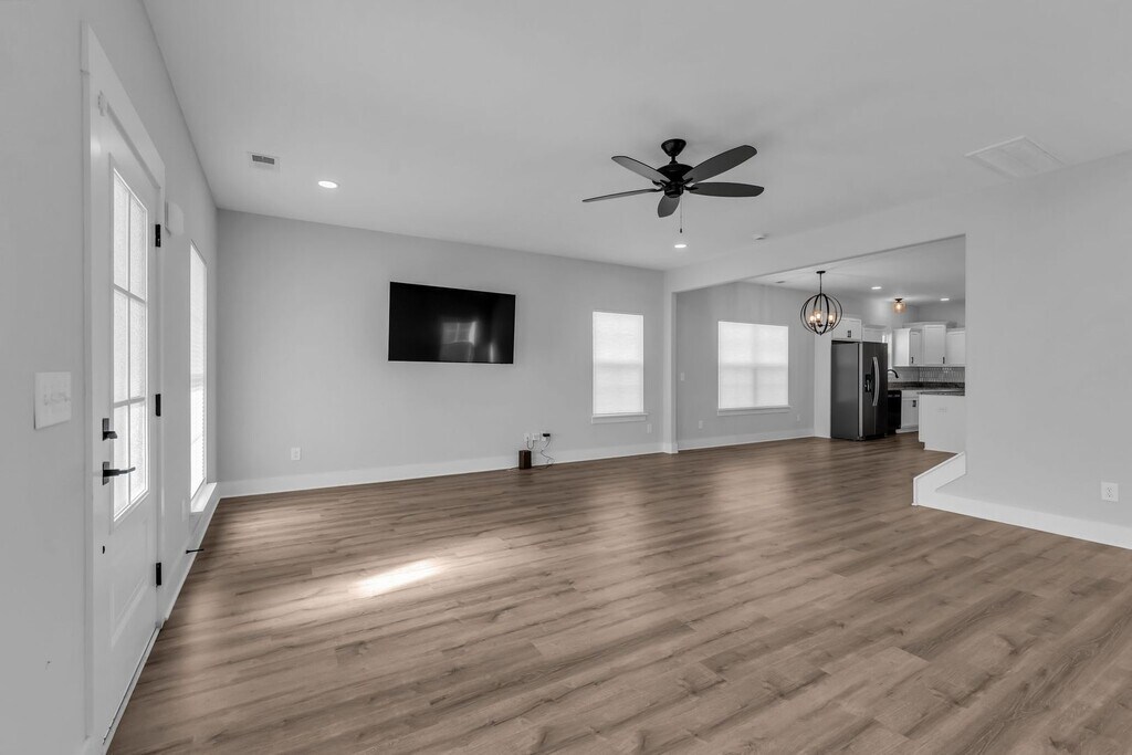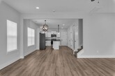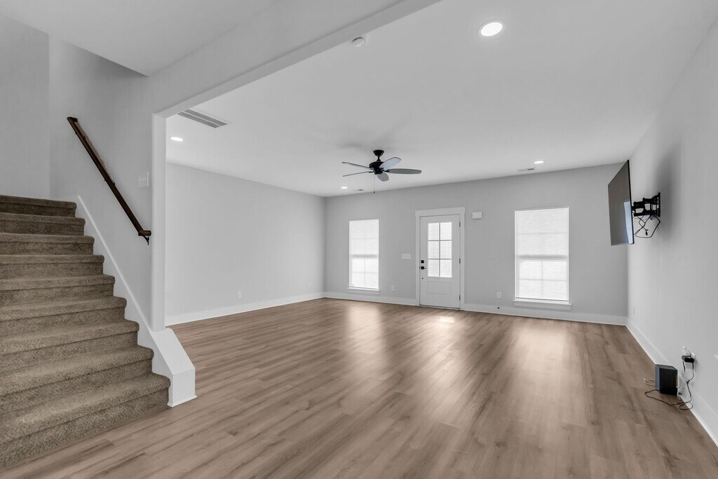 Welcome to this beautifully maintained home featuring a spacious open-concept floor plan designed for modern living. The main level offers an expansive living room and a bright, versatile office/flex space, with all bedrooms thoughtfully located upstairs for privacy. The kitchen shines with granite countertops, a large island, stainless steel appliances, pantry, and direct access to the covered patio—perfect for morning coffee or evening unwinding. The inviting rocking-chair front porch adds charm and curb appeal. Retreat to the primary suite with a designer walk-in tile shower and generous walk-in closet. Additional highlights include LVP flooring, a 2-car garage with a Wi-Fi–enabled garage door opener, and multiple valuable upgrades throughout. Built-in Murphy bed with mattress in guest bedroom Pest control included Lawn care included SimpliSafe security system installed TV mounts in the primary bedroom & living room EV charger in garage Larger-than-average fenced-in patio Street parking allowed Neighborhood Features: Convenient shopping, fitness/yoga, and everyday essentials nearby New retail space under construction at the neighborhood entrance Abundant green space throughout the community Walking trail located within the neighborhood This home offers comfort, flexibility, and lifestyle perks rarely found at this price point. Move-in ready and packed with upgrades — don’t miss it!