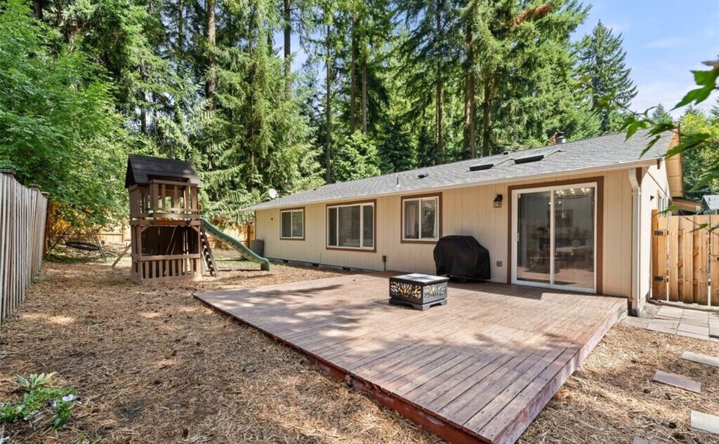 Welcome to this beautifully updated rambler located in the highly desirable gated Clearwood community. Enjoy resort-style amenities including three lakes, a boat launch, swimming pool, hot tub, sport courts, and multiple playgrounds. Inside, the home features fresh interior paint, brand-new flooring, and a thoughtfully updated kitchen with new cabinets, countertops, and newer appliances. Vaulted ceilings and skylights fill the living space with natural light. The generous primary suite offers a walk-in closet and a private bath. Step outside to a newly fenced yard with young fruit trees and a spacious deck—perfect for relaxing or entertaining. The property provides plenty of space for gardening or play. If you're ready for peace, privacy, and community amenities all in one place, this home has it all. Please contact for showings. All applicants 18+ apply; $45 per-person application fee. Applications can be found at Pets are handled on a case-by-case basis with an additional deposit.