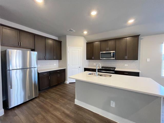 3-Bedroom 2-Bath Home with Flex Space; Corner Lot; Appliances Included! Welcome to this stunning, never-lived-in 3-bedroom + flex space, 2-bath home in the highly sought-after NorthStar community of Haslet, TX — available for move-in starting Nov-2025! Enjoy the convenience of stainless steel refrigerator, washer, and dryer already included — making your move seamless and stress-free. The versatile flex space off the entryway is ideal for a home office, den, or playroom, giving you the flexibility to tailor the space to your lifestyle. Sitting proudly on a spacious corner lot, this home features a bright, open-concept layout with elegant white granite countertops, rich espresso cabinetry, soft grey tweed carpeting, and warm grey EVP flooring that blend modern design with everyday comfort.