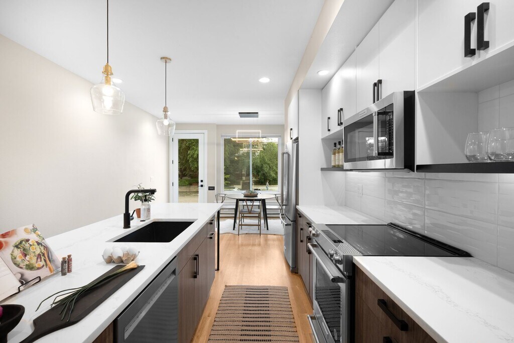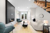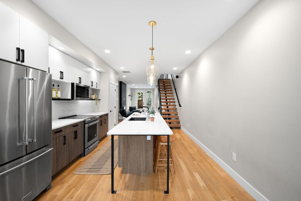 This newer construction 3 bed / 4 bath home is just two blocks from the light rail and moments from all the restaurants, bars, and energy of South Broadway. With clean lines, luxe finishes, and panoramic mountain and city views from dual rooftop decks, it’s a standout in both style and function. The open floor plan features real oak hardwoods throughout the main level and thoughtful, high-end details throughout. The kitchen includes soft-close cabinetry, a large eat-in waterfall island, custom black iron shelving, under-cabinet lighting, a pantry closet, and deluxe Bosch appliances. In the living area, enjoy a quartz-wrapped fireplace, pre-wired in-ceiling speakers, and a striking mono-rail staircase with wood treads and welded iron railings. Upstairs offers dual primary suites with designer tile, quartz counters, Euro-style glass showers, and modern lighting. Andersen windows bring in beautiful natural light on every level. The rooftop level features two private decks—one fully covered and west-facing with sweeping views of downtown and the mountains. Additional highlights include a central networking panel, high-efficiency furnace and water heater, central A/C, a 1-car garage with a WiFi-enabled opener and 220V EV charging outlet, and a private fenced yard with concrete patio, grass, and front/back sprinkler system. No HOA.