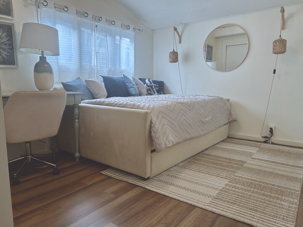 Stay steps away from the best restaurants and coffee shops in Pacific Grove, and blocks away from Lover's Point when you stay at this centrally-located beach cottage. This recently-renovated 710 sq ft cottage is the front unit of duplex and features 2 bedrooms, 1 bathroom, an open living room, an office area, and a full kitchen with island seating. The master bedroom features a king bed, large lighted closet, in-closet chest of drawers, nightstands with charging stations, and plenty of under-bed storage space. The second bedroom features a full-sized daybed with a pull out twin trundle and a desk for those working remotely. The living area includes a CB2 queen-sized sleeper sofa for overnight guests. The kitchen has a brand new refrigerator, range, microwave, toaster oven, coffee maker, espresso machine, and washer/dryer combo unit. The living space and master bedroom include TVs with streaming sticks and access to all popular streaming channels with your password. All utilities and yard maintenance included, which is a value of approximately $600/month. Small pets negotiable, though there is only a small front yard to be accessed in this front property. *Note there is no dedicated parking - on street parking only. This property is considered "walker's paradise" with a 93 out of 100 walk score, so most errands can be done on foot.