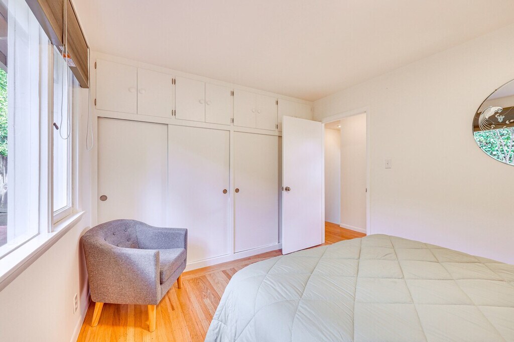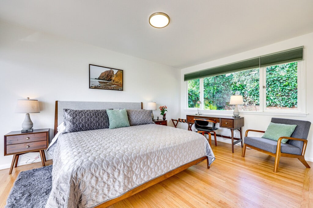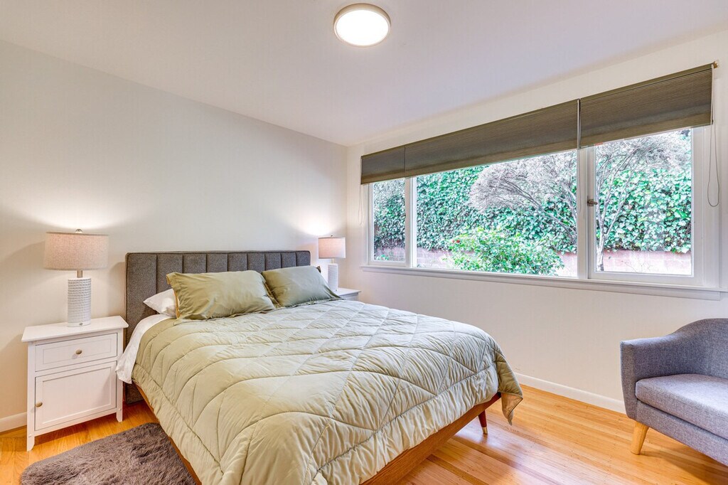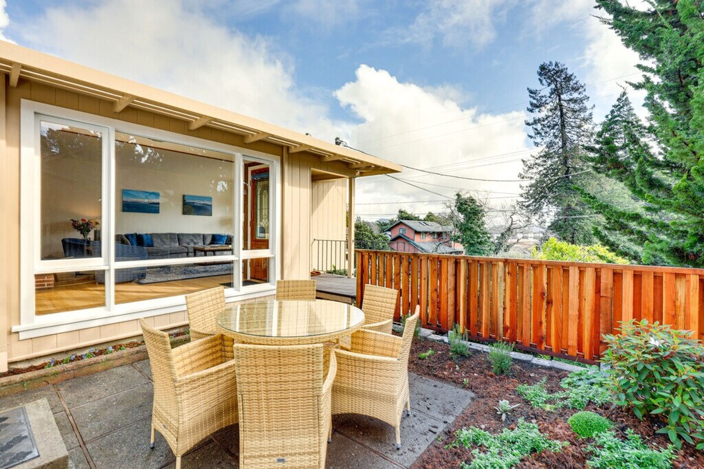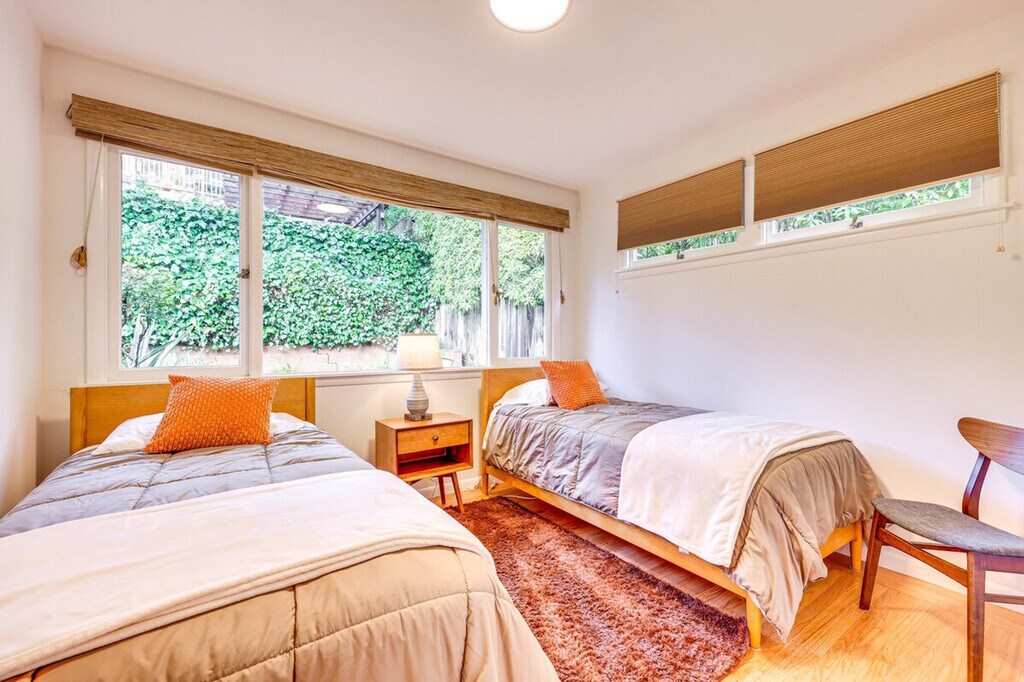 Nestled in the heart of Mill Valley, California, feel at home in this enchanting split-level home. This 3-bedroom, 2-bath vacation rental is the perfect retreat for your Bay Area escape. Exterior steps are required to enter and there is a sloped sidewalk on the right side of the house. Six additional interior steps are required to access the lower level and all of the bedrooms on the upper floor. This home features a charming interior, a full kitchen, a cozy sunroom, and a patio dining area. The kitchen is equipped with a drip coffee maker, cooking utensils, dishware, flatware, a dishwasher, a microwave, a toaster, and a kettle. Enjoy indoor entertainment with smart TVs, a fireplace, a dining table, books, and a desk. Other amenities include free Wi-Fi, keyless entry, central heating, complimentary toiletries, a hair dryer, hangers, in-unit laundry machines, laundry detergent, an iron/board, linens/towels, trash bags, paper towels, and 6 bathrobes. Parking is available in the driveway for 2 vehicles, and street parking is also available. With its proximity to a variety of attractions, this home lets you and your family relax with ease. While you're in town, consider relaxing at Muir Beach, grabbing a bite in downtown Sausalito, or exploring the bustling city of San Francisco, all just a short drive away. Enjoy easy access to hiking and biking trails. This home also features a fenced-in yard and partial bay views. Quiet hours begin at 10:00 PM. The property does not have air conditioning, but because of lower overnight temperatures and a mild climate, air conditioning is not typically necessary. There is one exterior security camera located at the front door facing the front steps and road. The camera is outward facing and does not look into interior spaces and records video when activated by motion. [SI]