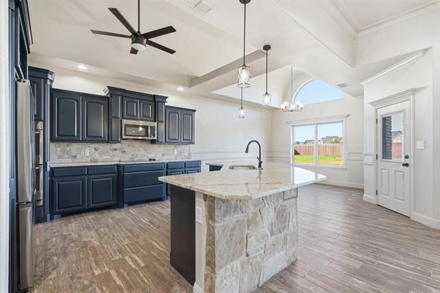 Welcome to your dream home nestled on a sprawling 1+ acre lot in the highly sought-after Wylie Independent School District! This beautifully updated 5-bedroom, 3-bathroom or 4-bedroom with Office, offers the perfect blend of modern comfort and serene country living—without the burden of city taxes. From the moment you drive up you will notice the beautiful landscaping, sprinkler system in the front and back and updated exterior paint. Step inside to discover a bright, open-concept layout featuring fresh updates throughout, including stylish flooring, updated modern farmhouse fixtures, fresh paint, and a chef-inspired kitchen with stainless steel appliances, double oven, large island and beautiful granite countertops. The open concept living, dining area provides plenty of room for entertaining. Secluded primary suite features a new walk-in tile shower, jacuzzi tub, double granite vanities and a large closet with plenty of storage. The well-appointed guest wing features two comfortable bedrooms + office space which could also be a 3rd bedroom, and a shared hall bathroom is centrally located for convenience, boasting modern fixtures, a full-size tub-shower combo, and stylish finishes that complement the home's overall aesthetic. Upstairs you will find a large en-suite which could double as a Game room. Enjoy peaceful mornings on the covered patio overlooking your expansive backyard. Refrigerator, double oven, microwave- willing to put washer and dryer and negotiate other furniture if needed.
