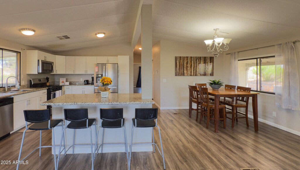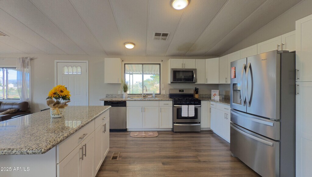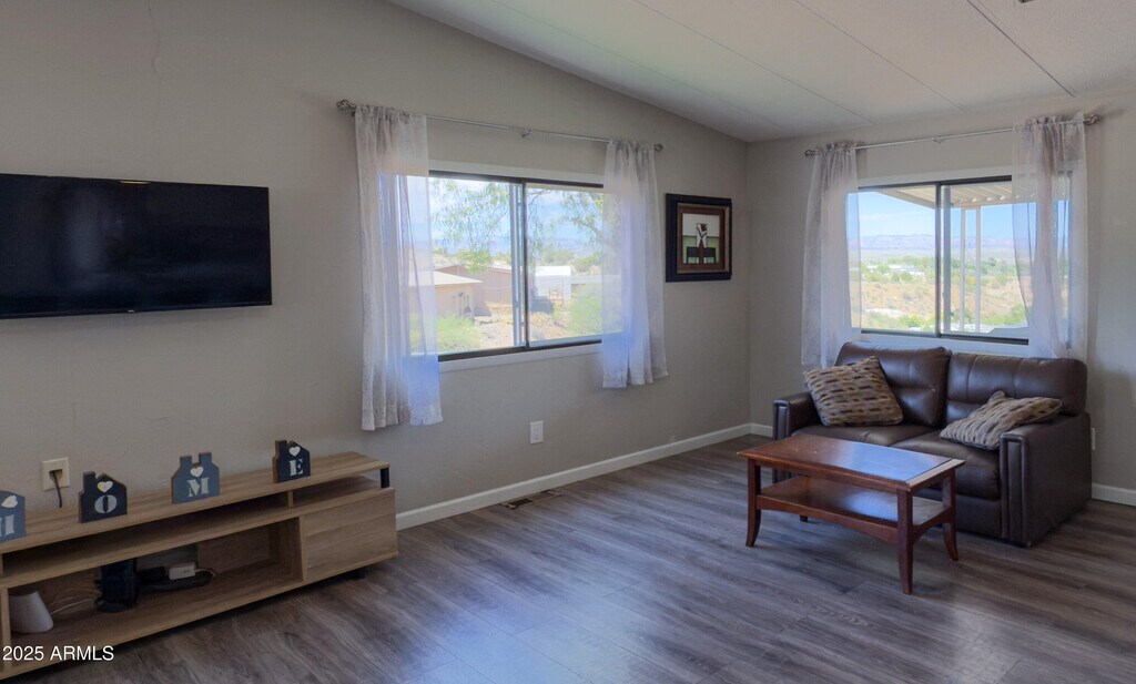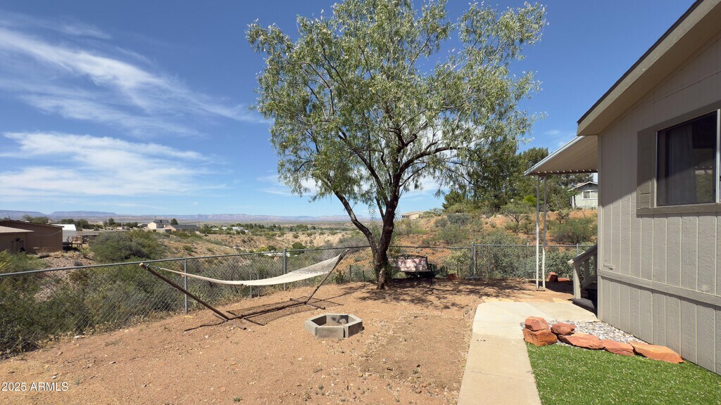 Located on a quiet cul-de-sac in Verde Village Unit 3,this 1982 double-wide manufactured home offers beautiful panoramic mountain and Verde Valley views. The property sits on a .27-acre lot with a fenced backyard,firepit,mature trees,and low-maintenance natural desert landscaping. Property backs to/presents unobstructed views of over 700 acres of State-owned open space. Inside,the home features an open layout with vaulted ceilings,updated flooring,granite countertops,and stainless steel appliances. The split floorplan includes a primary bedroom including an en suite 3/4 bath with a walk-in shower. Large windows throughout provide natural light and showcase the surrounding views. Owned solar,natural gas,and an attached storage room offers additional functionality,energy savings.