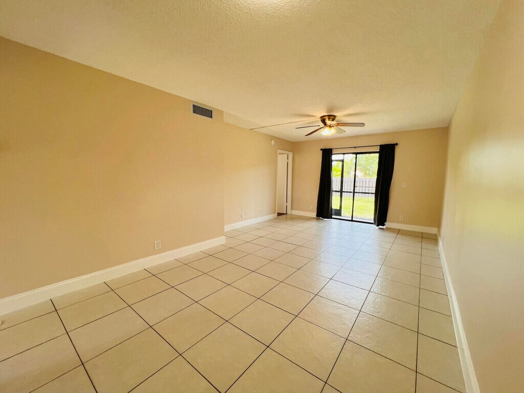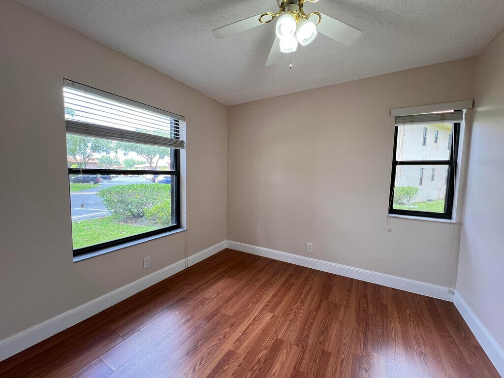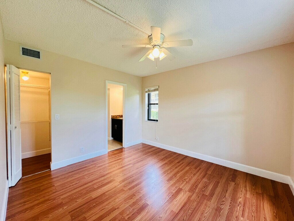 Corner,move-in ready unit with first-floor convenience. Enjoy parking right outside plus guest spaces nearby. Freshly painted inside. The kitchen has a double fridge,window for natural light,breakfast bar,pass-through window,and a Lazy Susan w lots of cabinets. All bedrooms and living room have ceiling fans. Spacious main suite has walk-in closet,en suite bathroom with tub and shower combo,extra closet space,and a handheld shower extension. Screened-in porch with doorperfect for morning coffee or unwinding at the end of the day. Accordion shutters for peace of mind and convenience. Enjoy a scenic lake with a wraparound trail and benches,a pool with shaded cabanas,and on-site laundry facilities. Easy stroll to Publix,Starbucks,Aldi,CVS,Dollar Tree,and Grove Market. MLS ID B26014926
