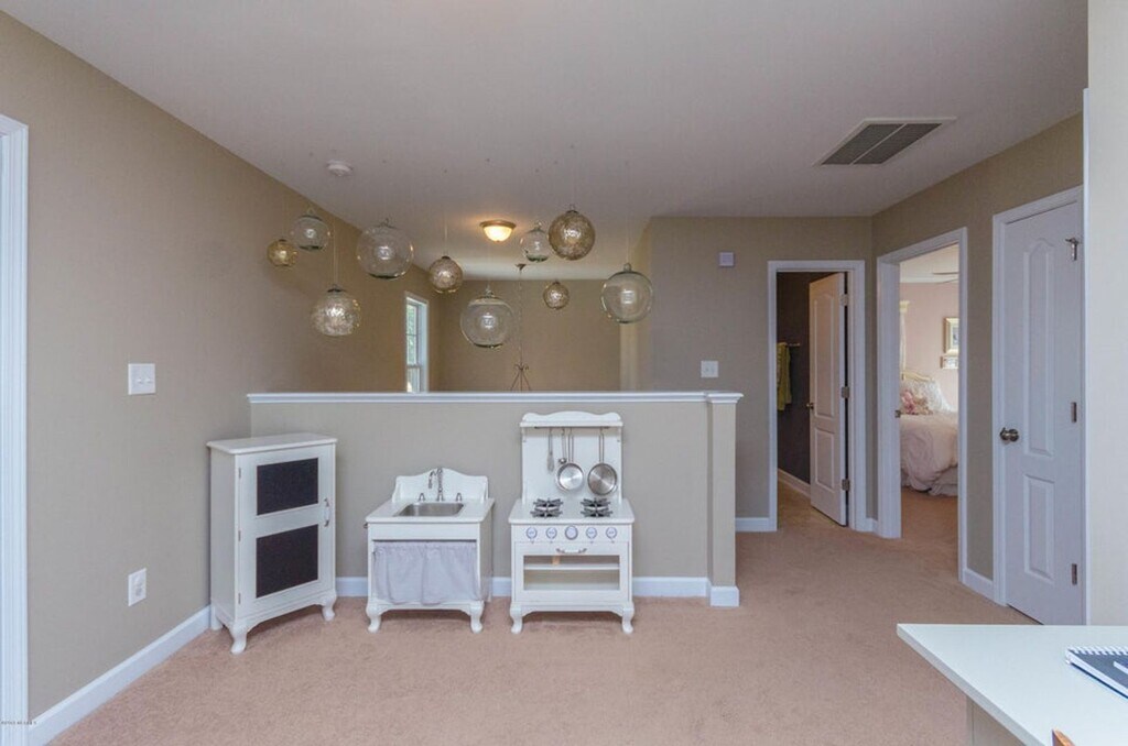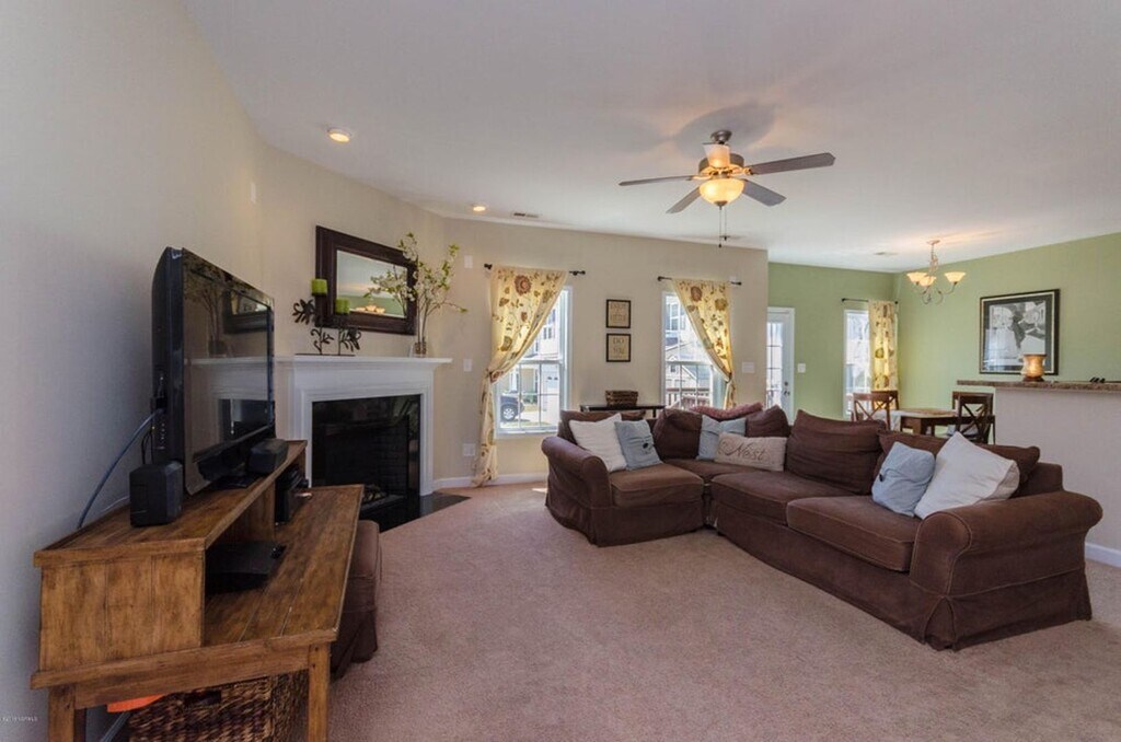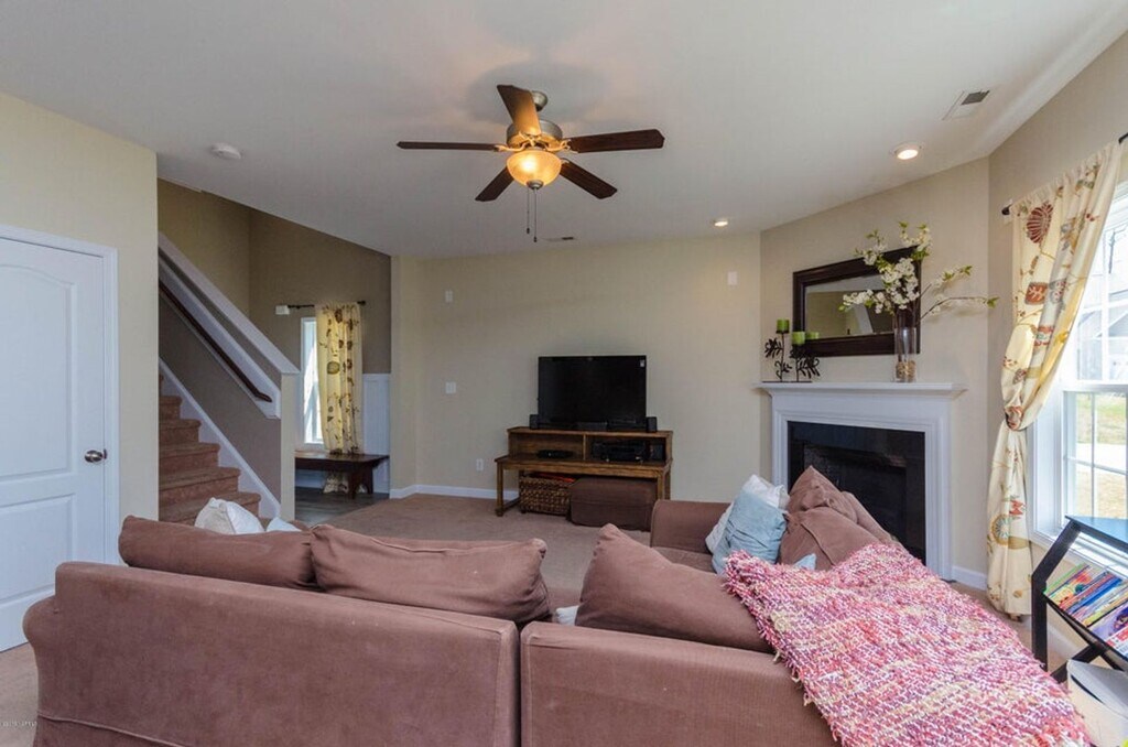 Well-maintained residence that features a beautiful foyer entry, open concept living room with cozy fireplace and plenty of natural light. The kitchen is open to the living room and boasts an 11x10 eat-in breakfast nook, stainless appliances, breakfast bar, and pantry. This immaculate 3 bedroom, 2.5 bath residence located in the much desired neighborhood of Peggy's Cove just minutes from the Camp Lejeune Sneads Ferry Gate. Upstairs, there is a split floorplan with an open bonus space. The master bedroom has 2 separate closets and a tub/shower combo. There is a rear deck and storage shed. This house is a corner house with no fence. Pets are negotiable. Please note that the pink bedroom has been painted a greyish/beige color since the photos were taken.