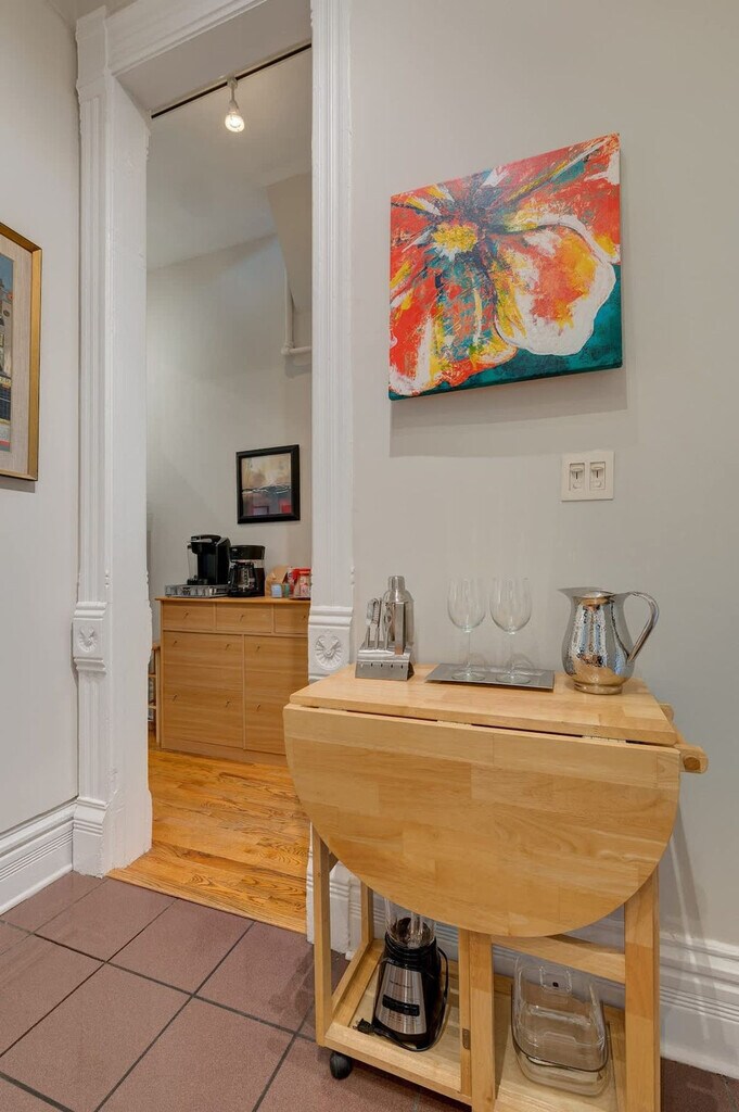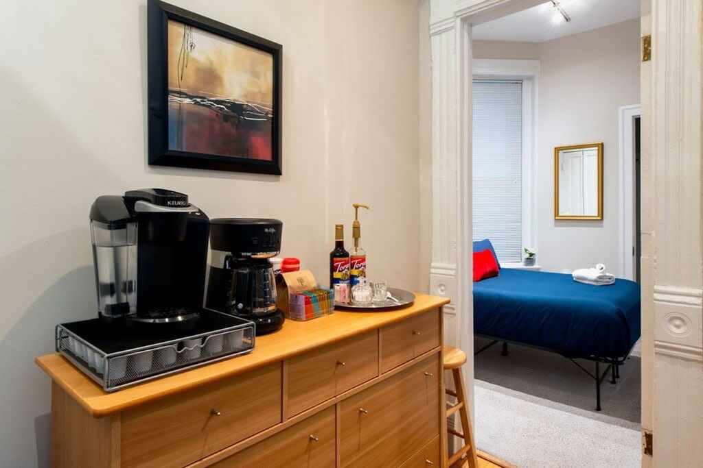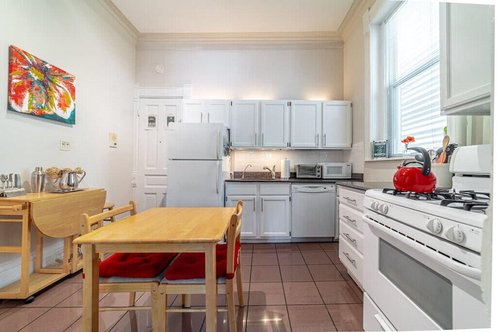 Feel at home in this architecturally significant residence, the "Boland House," built in 1886 on a beautiful tree-lined street in the Historic Old Town district. This lovely "Manhattan-style" unit is located five steps up to enter the front double doors. With high ceilings and vintage charm, this apartment has a large flat-screen TV and speedy internet. The fully stocked kitchen includes an ice-maker, microwave, dishwasher, and espresso machine. The fireplace mantle features the original etched granite from the late 1800s. Dine al fresco on the patio with a barbecue grill and rocking lounger. There are two public parking garages within one block (at Piper's Alley on North Avenue, and the History Museum's garage at Clark and LaSalle Streets. Enter on Stockton Drive. The Museum’s secure, well-lit parking facility is open 24 hours a day, 365 days a year.) Located in Chicago's most sought-after neighborhood, Lincoln Park's Old Town district keeps up a lively pace day and night, with close proximity to the lake and downtown. Just a block away is the neighborhood's namesake park with 1,208 acres of green space and lagoons with a free zoo open year-round, a nature museum, and an incredible conservatory. The Old Town Triangle district is a landmark neighborhood proudly listed on the National Register of Historic Places. There is no smoking of any kind in the unit, and your reservation will be automatically and immediately canceled if there is any smoking reported. There will also be an automatic $500 cleaning fee if there is any smoke smell inside of the unit. Quiet hours are from 10 pm to 8 am. There is an automatic $100 late check-out charge if you're still in the property 20 minutes after check-out. USPS mail deliveries are not allowed during your stay. There is a $45 fee if you lock yourself out or lose your key. [SI]