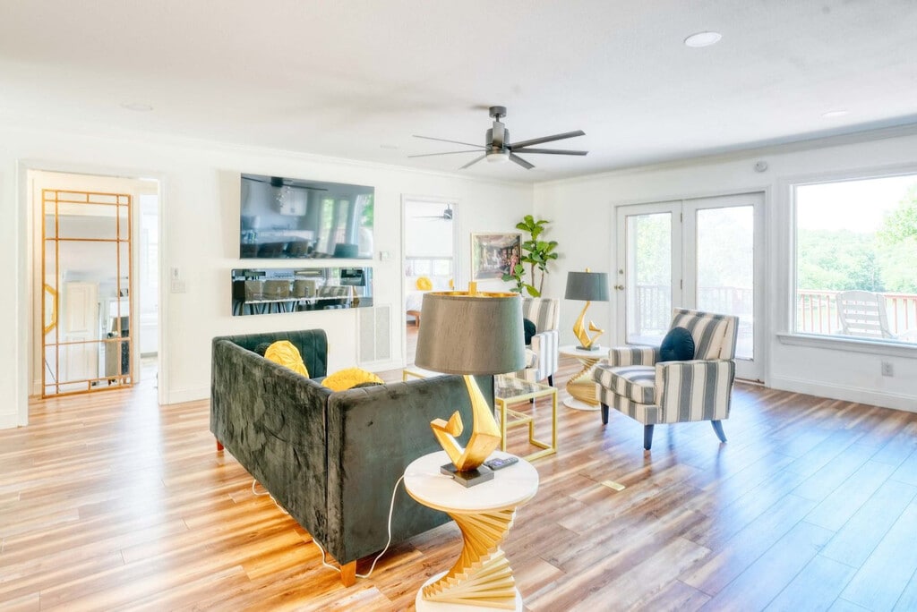 Welcome to a modern lakefront retreat on Lake Avalon, offering the perfect mix of relaxation, fun, and scenic views. This home features stylish interiors, flexible sleeping space, and direct lake access, making it ideal for families, groups, or couples looking to unwind. With three king bedrooms, a room with three single beds, and four full bathrooms, you'll feel at home in this spacious property. The light-filled open concept living area provides comfortable seating, a smart TV, and stunning lake views. The dining table seats up to 10, with additional seating at the breakfast bar. The fully equipped kitchen includes stainless appliances, Keurig and drip coffee makers, a toaster, a blender, cookware, spices, and more. Enjoy outdoor dining with a grill available on the patio. The lower-level bonus space features a pool table, sectional sofa, kitchenette, and TV, perfect for family game nights or movie marathons. Free parking is available, and the property offers family-friendly amenities. Enjoy the private dock with seating and free kayaks for a day on the lake. Nestled in a peaceful Bella Vista neighborhood, this lakefront home offers a perfect mix of privacy and proximity to outdoor adventure. Located on Lake Avalon, you’ll enjoy scenic views and direct water access right from your backyard. Just minutes from the Tunnel Vision Trail, part of the Little Sugar Trail System, it's ideal for mountain biking and hiking. A short drive takes you to local grocery stores, restaurants, and coffee shops for all your essentials. Bella Vista Golf Club is just half a mile away and open to the public, while Tanyard Practice Facility is conveniently located right across the street. This property maintains a no-smoking and pet-free policy to ensure cleanliness and comfort for all guests. No parties or events are allowed to respect the tranquility of the neighborhood. Enjoy hassle-free check-in with smart lock access, and rest assured with security cameras located on the exterior near the garage and back porch, as well as inside the garage. A verification process is in place for your protection, and our team is ready to assist with any maintenance issues that may arise during your stay. With fast Wi-Fi and a dedicated workspace, this home is ideal for remote work, ensuring you stay connected and productive during your stay. [SI]