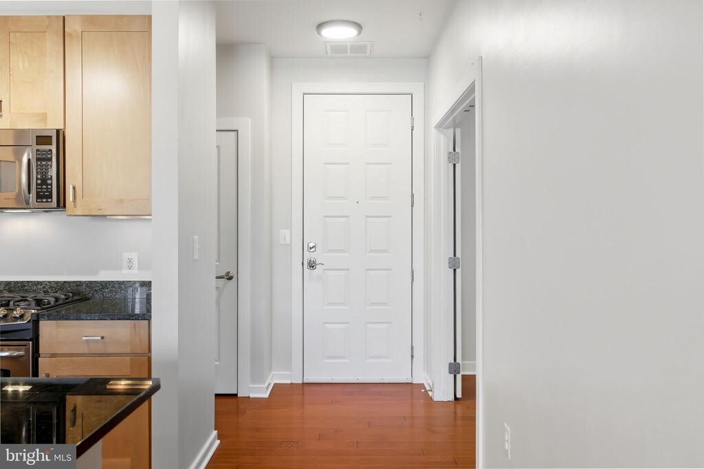 One bedroom + den. Tons of sunlight with 11 foot floor-to-ceiling windows on the top floor. Quiet and secure condo that is walkable to local restaurants, boutique shops, and parks. Stainless appliances, granite counters, lots of cabinet space with spacious island. Hardwood floors throughout. Washer/dryer. Six minute walk to East Falls Church metro – perfect for commuters on Orange and Silver metro lines to DC/Tysons. Easy access to I-66. Modern fitness center, security desk, party room with full kitchen and pool table. Secure garage parking. One year minimum. Security deposit. Move in/move out fee $150.00 plus $50 lease registration fee. Water, sewer, trash removal included. Tenant pays electric, gas, cable/internet. No smoking. Small dogs possible with pet deposit. About the WestLee: Award-winning, energy efficient Westlee Condominium is a boutique style urban building. Controlled access entrance lobby with staffed front desk, and excellent on-site management. Fitness center and social room/library with billiard table, piano, fireplace, bar and catering kitchen. Bedroom: Hardwood floors, ceiling fan, walk-in closet with lots of shelving, floor to ceiling window/sliding door with blinds, and Juliette balcony. Bathroom: Soaking tub/shower, limestone floors, granite counter. Undersink cabinet and medicine cabinets provide storage space. Den: 10 feet x 10 feet with double doors and is the perfect space for an office, nursery, or guest space. Kitchen: Gourmet chef's kitchen with gas stove and range, features Energy Star stainless steel appliances, under cabinet lighting, granite countertops, maple cabinets, and a large island with breakfast bar. Living: Beautiful and quiet Minka ceiling fan, nest smart thermostat. Storage unit: Approximately 5x5x9 floor to ceiling caged storage unit in the garage (available at additional cost). Other: Rinnai tankless water heater ensures that you will never ever run out of hot water while minimizing energy bills. Parking: One convenient and secure/gated reserved garage parking space. Location: One block off I-66 exit 69 on Lee Highway. 6 minute walk to EFC Metro and 1/2 mile to the heart of Falls Church (Saturday morning/Falls Church Farmers Market, restaurants, library, parks, and the State Theatre). It is a 5 minute drive to Eden Center, Seven Corners or Tyson's Corner and 10 minute drive to D.C. Immediate neighborhood is a mix of single family homes, townhomes and condos with service, and commercial businesses. Across the street from the W&OD Trail, restaurants, and locally owned retail. Minutes’ walk from parks, soccer fields, and basketball courts.