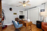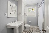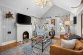 Charming Berkeley cottage featuring a welcoming front porch with iron railing. Step inside to a light-filled living room with vaulted ceilings, hardwood floors, and a decorative fireplace. The living, dining, and kitchen areas flow together, creating an open and comfortable layout. The kitchen includes granite countertops, a gas range, breakfast bar, and a built-in corner cupboard. It overlooks the backyard, offering a pleasant view and easy access for entertaining. The spacious primary suite features a large bathroom with a jetted tub, separate shower, double sinks, vanity, and heated floors. Two additional bedrooms share a hall bathroom. Recent updates include recessed lighting and a deck off the back of the home. The private backyard features low-maintenance turf and an eight-foot wood fence for privacy. This home combines classic Berkeley character with modern touches, offering comfortable living in a desirable location.