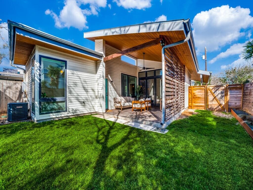 Bright, modern, freestanding HOUSE in the heart of Bouldin. Private, fenced yard. Amazing location. Beautifully furnished (or not) and all bills paid, including Google Fiber. Very quiet, private, and feels much larger than its 850 square feet. High ceilings, clean modern design and a huge covered porch. Primary bedroom has blackout shades and a super luxe queen bed. 2nd bedroom is a walk-through with a motorized walnut sit/stand desk and a modern sofa that converts to 2 twins or a king bed. Newer construction with perfect Bouldin location. Gas range, tons of kitchen storage, and large pantry. Washer and dryer included. Steps from Mattie's and their famous peacocks. Easy walk to Fresa's, Nomade, Lenoir, Thai Fresh, Bouldin Creek Cafe, Dovetail, and so much more. Occupied, appointment required to show. Available November 3rd for 2-12 month lease.