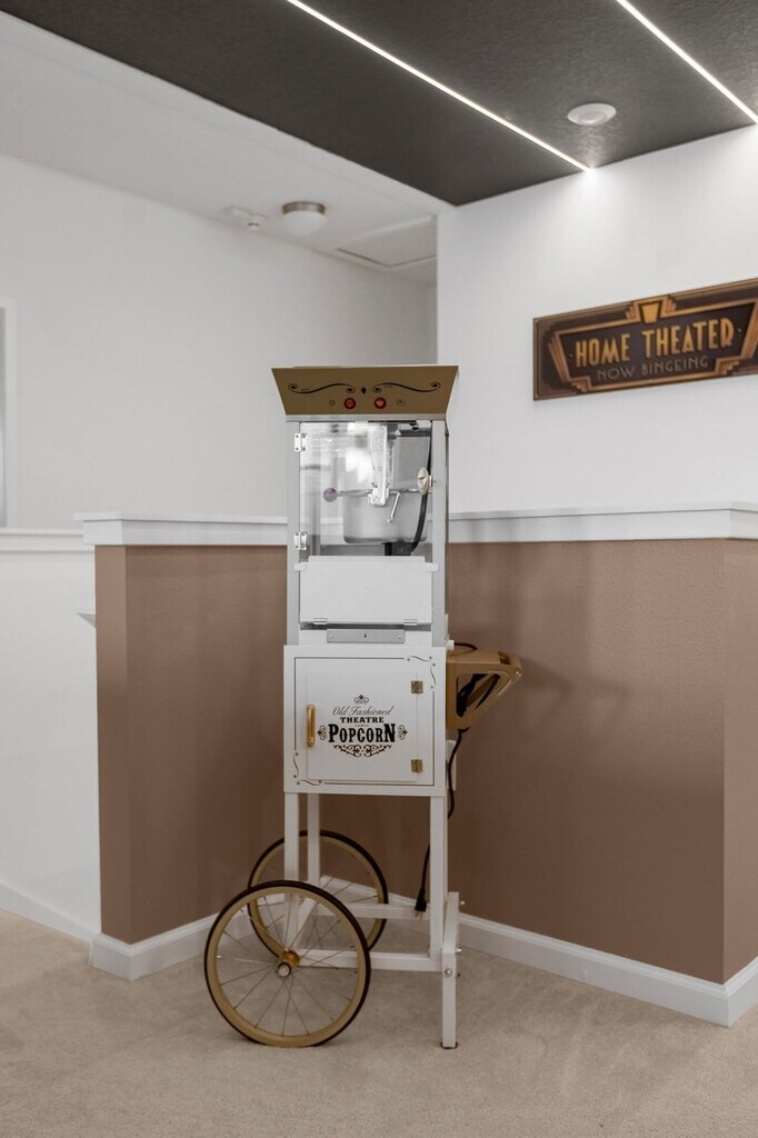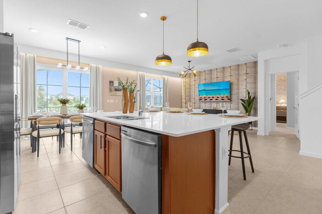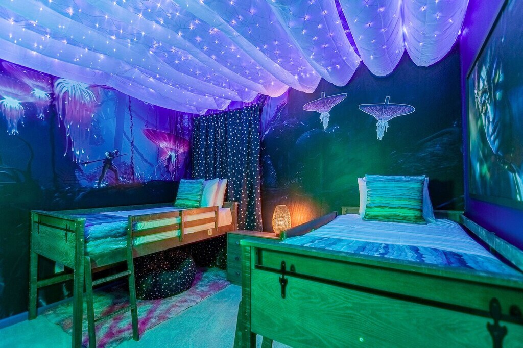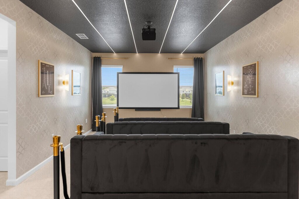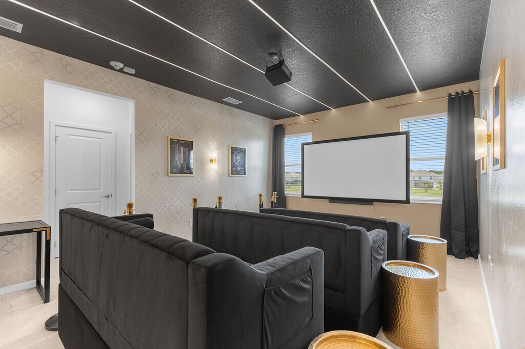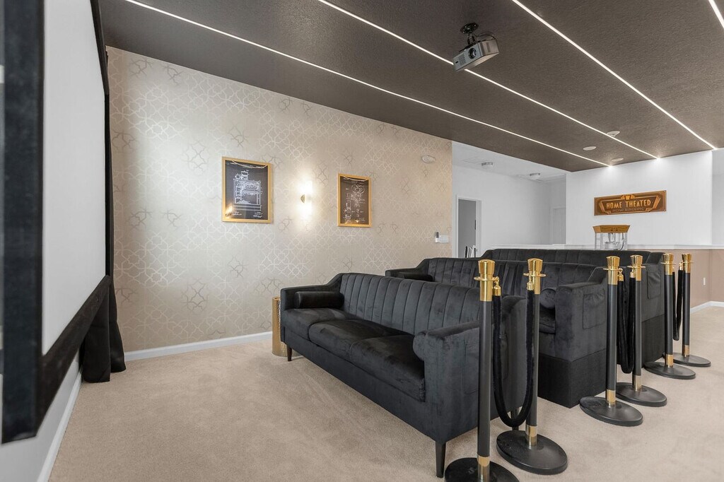 Feel at home in this unforgettable 8-bedroom, 5-bathroom home at Bella Vida Resort, accommodating up to 18 guests. This home delivers entertainment and comfort at every turn. This home features a private lake-facing swimming pool with a removable safety fence, a spacious screened-in patio with sun loungers, and a covered outdoor dining area with a BBQ grill. Enjoy a home theatre with a projection screen, cinema seating, and a popcorn machine, as well as a jungle-themed kids’ room with a treehouse bunk bed, slide, and ball pit. There is also a karaoke room with a stage and microphones, a billiards table, and a Hot Shot Hoops basketball arcade game. The open-concept living room includes a 75" Smart TV and plush seating. The fully equipped chef’s kitchen features 2 fridge/freezers and 2 dishwashers. There is a large indoor dining table for group meals and a poolside dining set-up for 6. All bedrooms feature 55" Smart TVs, fresh linens, and fluffy towels. Pool heating and hot tub heating are available for $35 per night each, or a pool and hot tub combo can be added for $60 per night with a 2-night minimum. A BBQ propane tank can be delivered for $70, and a pack 'N Play crib and highchair are available for rent at $40 each. Located at the secure, gated BellaVida Resort, this home is just minutes from Disney and surrounded by restaurants, supermarkets, and shopping. It is approximately 15 miles to Walt Disney World, 15 miles to Universal Studios Florida, 16 miles to Orlando International Airport (MCO), and 2 miles to nearby dining, grocery stores, and shopping centers. Renting a car is recommended for getting around Orlando, but alternative options include public transportation, taxis, and Uber. Resort amenities include a heated resort pool, an outdoor jacuzzi, a clubhouse lounge, a fitness center, sand volleyball, a basketball court, nature trails, a kids’ playground, and a Cyber Cafe. Parties, events, and smoking or vaping of any kind are prohibited in or around the property and risk a fine of $150. Late departures will result in a fine of $150 for each additional hour the property cannot be accessed for turnover. Outside of service animals, pets are not permitted at this property, and any evidence of pets will result in a fine. Firearms and weapons are strictly prohibited in this home. To help ensure a safe and trusted experience for all guests, ID verification may be required after booking. Includes a laptop-friendly workstation and high-speed Wi-Fi. Mid-stay cleaning is available for reservations over 3 days in duration for an extra fee and will need to be booked in advance. [SI]