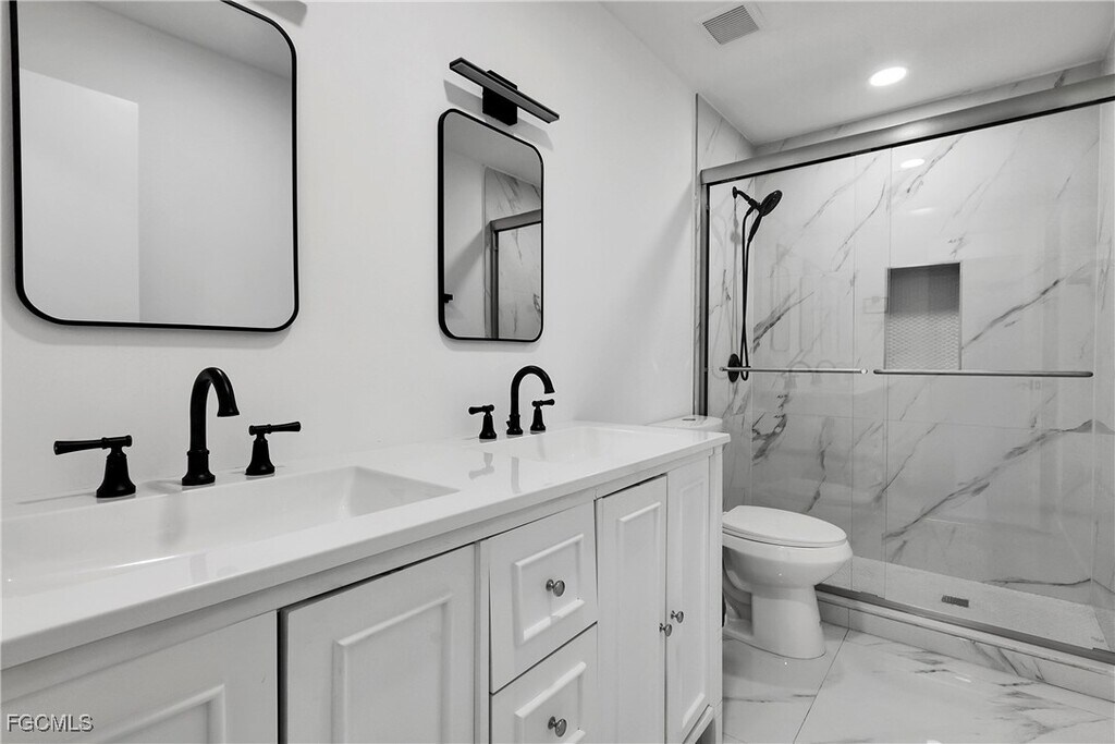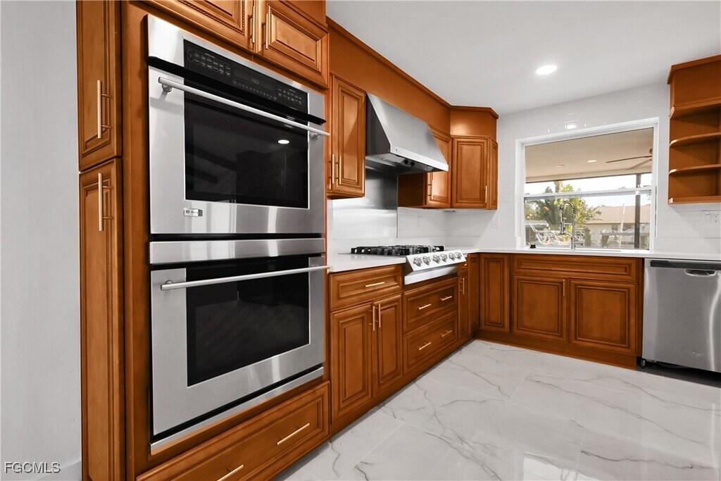 Fully remodeled canal-front home featuring 3 bedrooms,2 bathrooms,and an open floor plan. Updated kitchen (2019) includes white quartz countertops,stylish cabinetry,stainless steel appliances,double electric oven,and gas stove. Great room offers a wood-burning fireplace with rustic stone detail. Laundry room and 2-car garage provide additional convenience. Home is equipped with surge/storm protection barriers for added security and peace of mind. Enjoy canal views from the large screened lanai,outdoor entertainment space,and private dock. Dock includes two boat lifts — one up to 8,000 lbs and one up to 25,000 lbs — Accommodating large boats. Choose your dock! Additional 8.5 ft x 15 ft concrete block utility/storage building on property. N.