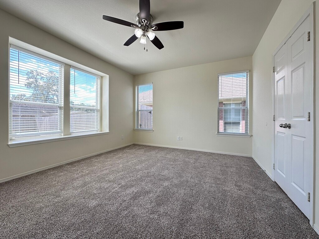 LAWN CARE INCLUDED. beautiful 4 BR in conveniently located neighborhood. You'll enjoy coming home to your welcoming front patio with space for your favorite chair and be greeted with a open floorplan and high ceilings. Enjoy big windows and gas fireplace in the living room with cathedral ceilings and open flow to the kitchen. Plenty of cabinetry,walk-in pantry,counter-space. Separate formal dining. Primary bedroom downstairs with beautiful natural light. Bath has double sinks,separate shower/soaking tub and oversized walk in closet. 3 bedrooms upstairs,all spacious with ceiling fans,high ceilings. So many options for the game room! There is space for game tables,sofas and entertainment! Fresh paint,brand new carpet throughout! In house laundry,half bath,2 garage remotes. Back yard fenced with concrete sitting area. Sprinklered yard! Short drives to schools,dining,shopping and movie theatre. Easy commutes to I-45,Lake Conroe,Grand Parkway 99,Hardy Toll Road,Huntsville. MLS# 37302474