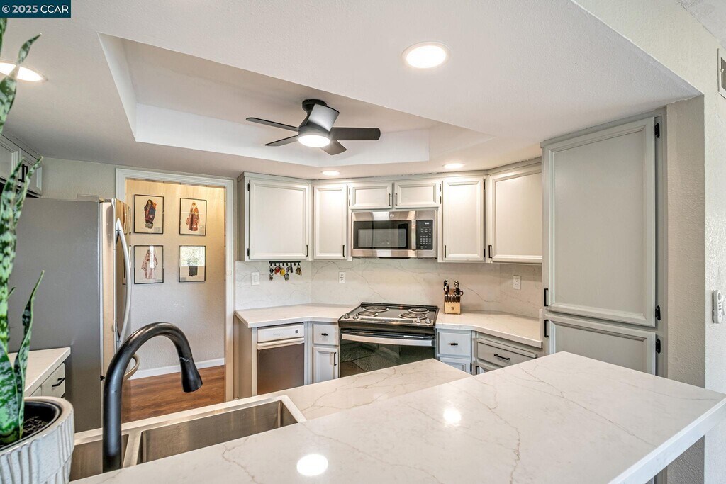 Beautiful condo located in prime North Hayward location. With nearly 1500 sq ft of living space,this single level condo offers 3 spacious bedrooms,2 full bathrooms and in unit washer and dryer. Corner location offers tons of light light,privacy and views. Recently refreshed carpet & paint with designer touches throughout. Updated kitchen features new quartz counters,stainless steel appliances and a breakfast bar. Large dining room will fit most any dining set plus buffet and more. Large living room a sliding glass door with views of trees that leads to a balcony. Generously sized primary suite with walk in custom closet & en-suite bathroom with two vanity areas and a stall shower. Two spacious bedrooms down the hall,hall bathroom with shower over tub. One parking space included,detached garage with up to 3 car parking for an add’l fee plus storage areas available as well. Water & trash included in rent. Great community with a club house,gym,pool and spa. Awesome location just one block to Safeway,Starbucks,City Sport gym,close to downtown Hayward. Quick freeway access,close to I-880,I-580,I-238 and a short distance to Castro Valley B.A.R.T.. Available for move in mid October,1 year lease minimum,pets upon approval.