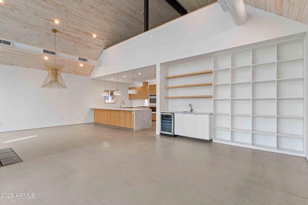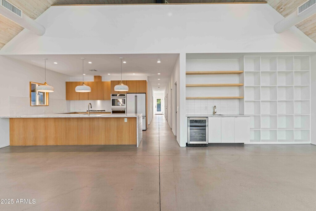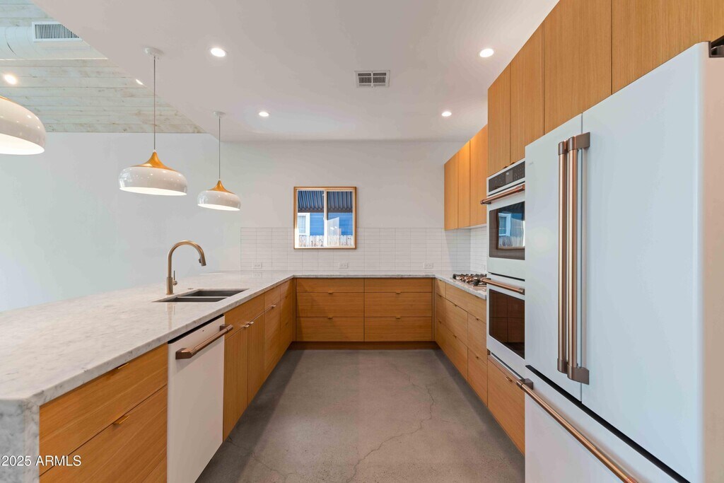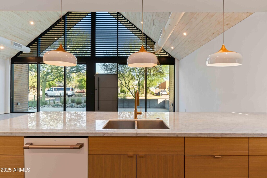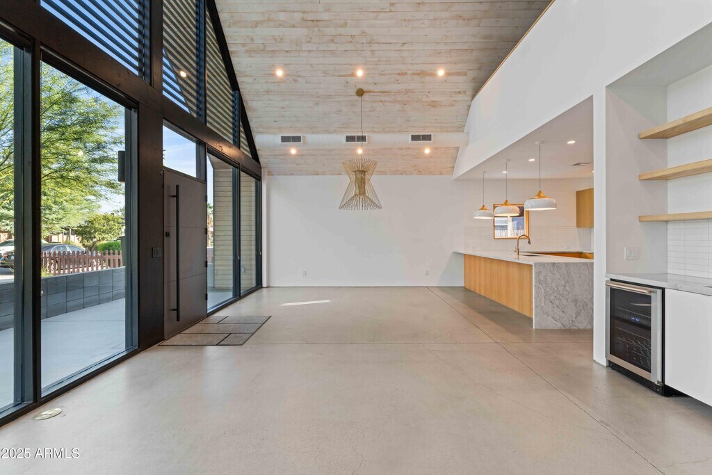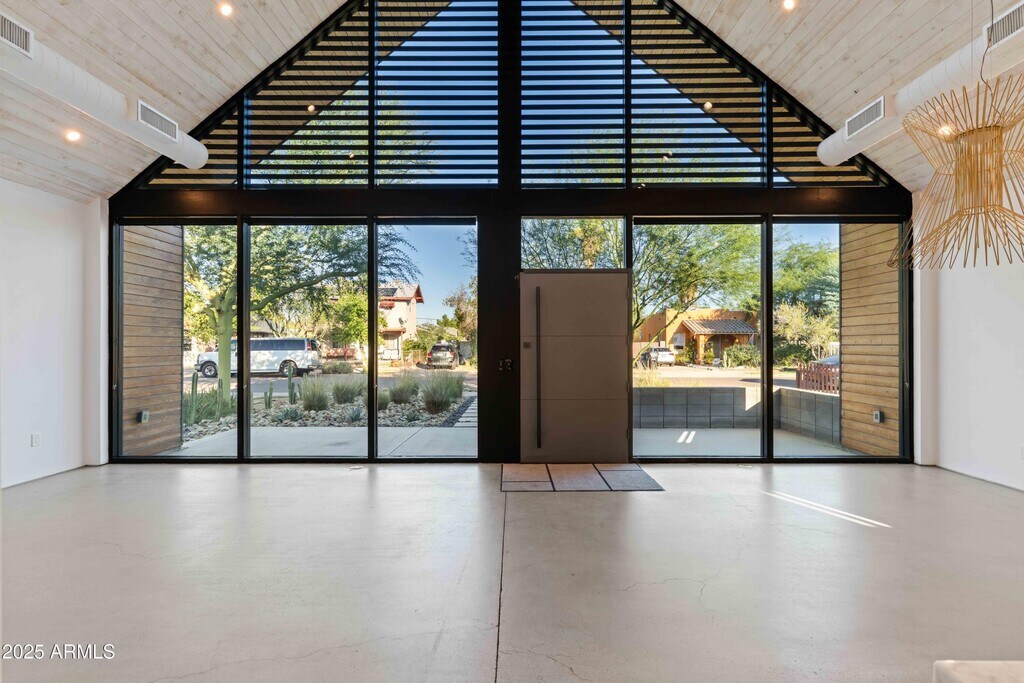 A truly one-of-a-kind Scandinavian modern residence,envisioned and crafted by renowned designer Joel Contreras. Perfectly positioned on one of the most sought-after streets in the ''historically modern'' Coronado Historic District,every detail of this home was executed with precision and care. Soaring 20-foot vaulted ceilings create a dramatic first impression,complemented by custom white oak cabinetry and marble countertops throughout. The interior showcases engineered oak hardwood flooring upstairs and polished concrete floors downstairs,paired with designer lighting and plumbing fixtures for a striking contemporary finish. Additional highlights include a tongue-and-groove ceiling,full spray foam insulation,a corrugated metal roof,and an impressive front façade of dual-pane,argon-insulated glass. In the back,enjoy a versatile covered parking space that doubles as a party-ready pergola. Solid-core white oak doors add warmth and sophistication at every turn. All of this,just a short stroll or bike ride from some of Phoenix's trendiest dining and entertainmenturban living at its absolute finest.