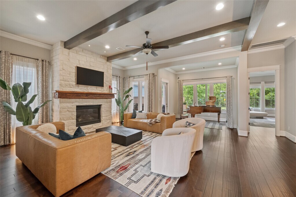Remarkable home with with elegant finishes and upgrades throughout. There's so much to love; from the front porch with lake views,to the wonderful layout,stunning primary suite,gorgeous kitchen,covered back patio with a fireplace,and private backyard. This house has so many "wow factors". The gorgeous kitchen is open to the breakfast area & the beautiful living room with a fireplace. The primary bedroom is large and elegant,with a primary bath to die for. The primary closet is amazing with direct access to the laundry room. The first floor also features an excellent study,formal dining room,butlers pantry,huge walk in main pantry,an oversized laundry room,and 1/2 bath for guests. Upstairs you find 3 wonderful bedrooms with 3 more full bathrooms,the game/media room,and an extra space for storage or future bed #5. Out back is very private with woods behind the home. Plus,this home already has a whole home generator & is zoned to exceptional schools. MLS# 15148276