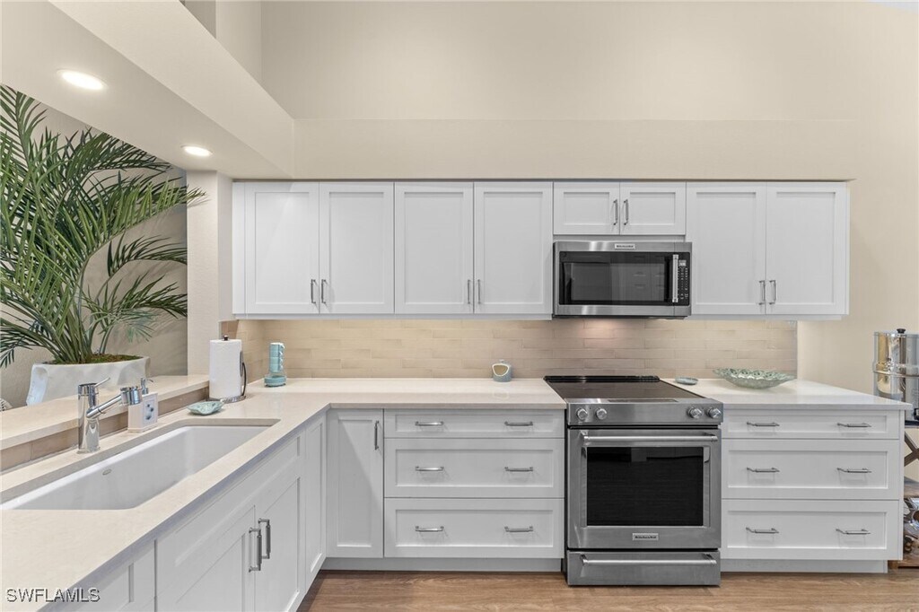 Welcome Golfers! Enjoy captivating lake and 12th hole golf course views from this stylish,designer-inspired 2-bedroom,2-bath condo with a one-car garage and carport,located in the highly desirable Heatherwood neighborhood of the bundled golf community of Stonebridge. This light-filled residence offers an inviting indoor/outdoor living experience with vaulted ceilings,a split-bedroom floor plan with en-suite baths,and abundant natural light throughout. Recent upgrades include luxury vinyl flooring,new kitchen cabinetry with soft-close drawers,KitchenAid appliances,quartz countertops,and a tile backsplash,creating a modern and functional living space. Heatherwood has recently undergone extensive renovations,including new roofs,fresh exterior paint,updated trim,and modern fixtures,enhancing both beauty and value. Just a short stroll away,enjoy the newly renovated Stonebridge Clubhouse,featuring casual and fine dining,a state-of-the-art fitness center,Har-Tru tennis courts,a heated Olympic-size pool and spa,and a challenging 18-hole championship golf course. Ideally located in North Naples,this home is minutes from Mercato,Whole Foods,premier shopping and dining,and the white sugar-sand beaches of the Gulf.