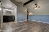 Gorgeous updated 1 bedroom loft,1.5 bathroom. Pergo flooring throughout. Gorgeous kitchen with Granite counter tops and stainless steel appliances. Multiple closets. Light and bright. Bathroom upstairs and down. Storage,large closets. Laundry room on property near unit. 1 car carport in back. Roof top patio over garage,gazebo in back,grass area with lush landscaping you will not be disappointed. Property is located with easy access to the freeway,schools,restaurants,light rail,gyms and down town Phoenix is not far either. Come,Show and rent today.