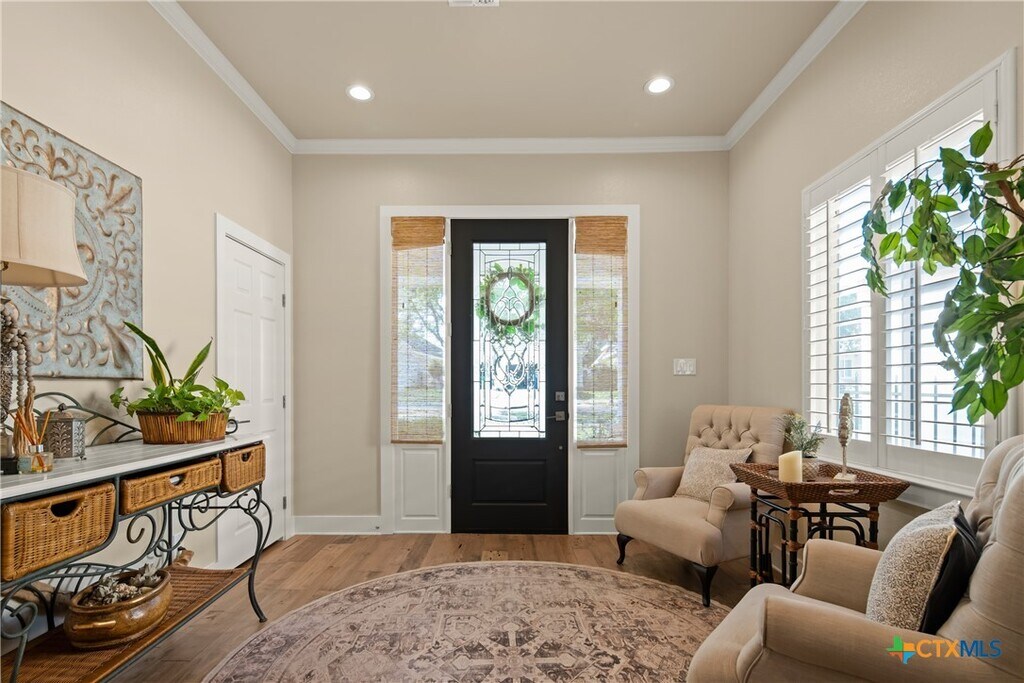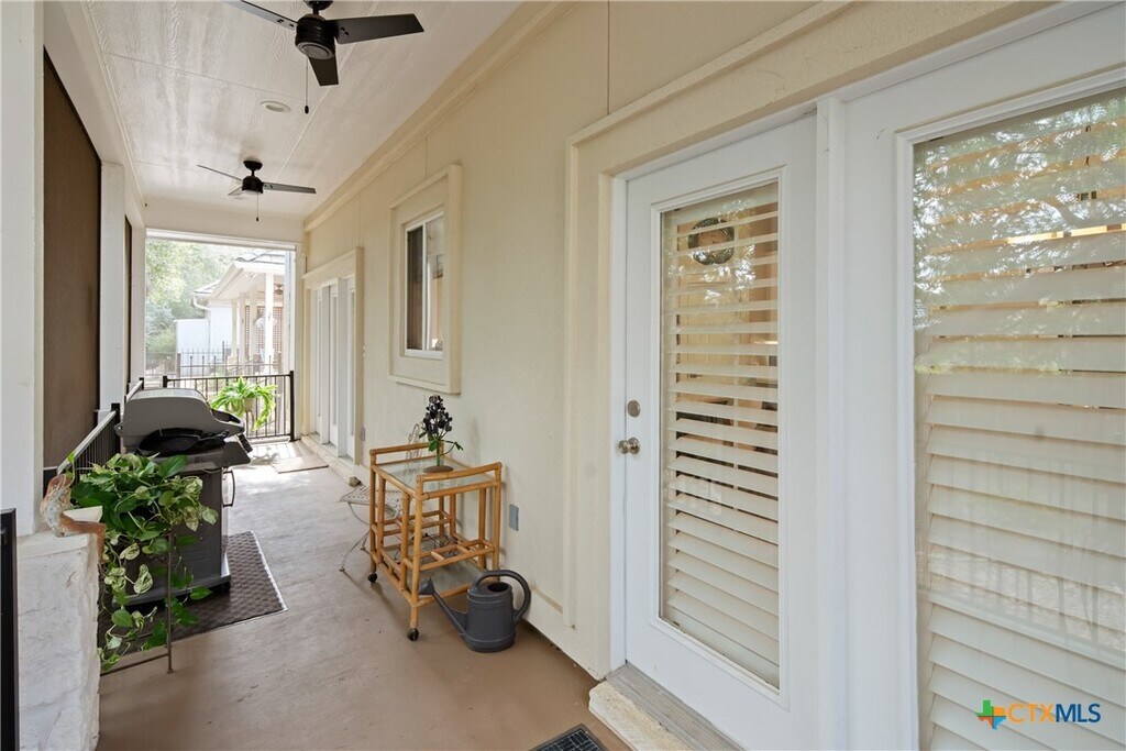 Step into this beautifully designed home through an impressive front door that opens to a welcoming foyer with a convenient coat closet. The open-concept living room boasts high ceilings,abundant natural light,and stunning Mesquite-engineered wood floors,plantation shutters throughout and beautiful built-in cabinets surrounding gas log fireplace. A fabulous cedar-screened porch off the living area provides additional entertaining space,while a second screened-in porch off the kitchen and primary bedroom offers a peaceful retreat with wooded views—perfect for relaxing without the worry of mosquitoes. The updated kitchen features new granite countertops,freshly painted cabinets with new pulls,a center island,cooktop,built-in oven and microwave,wine refrigerator,and pantry. A handcrafted wrought iron staircase with Red Oak steps leads to the second floor,where you'll find two bedrooms,jack and jill guest bath and a versatile study or craft room with built-in cabinets. The primary suite is conveniently located on the main level featuring doors that open to back screened-in porch; beautifully updated bath,walk-in closet; large built-in safe. Utility room and powder room located on main level. This charming home is nestled in a secure,gated community with a "lock and leave" lifestyle and friendly neighbors who look out for one another. HOA maintains each yard in the community. Don’t miss this rare opportunity to own a stunning,thoughtfully designed home in a prime location!