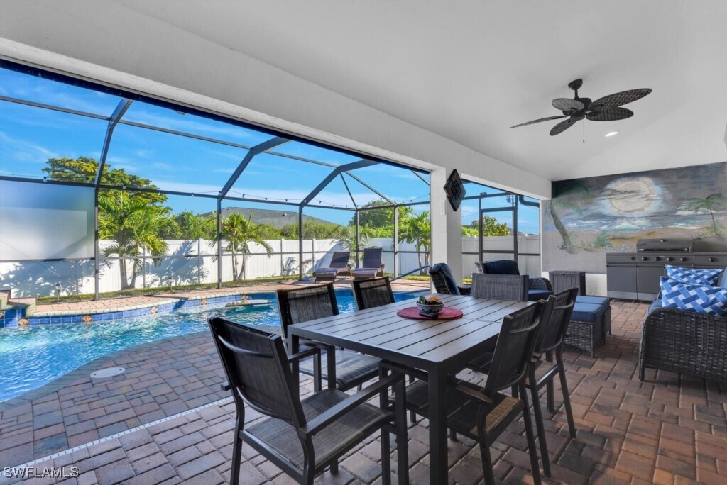 Aqua Dream Escape,your dream vacation location! This home is perfectly appointed for the ultimate family escape and will be sure to deliver hours of fun and entertainment for the whole family! This stylish home boosts amenities to be enjoyed from sunrise with your first cup of java brewed fresh at the coffee bar until sunset,grilling outdoors by the pool with an evening beverage in hand. A bonus room features a gaming table with 50 different selections to choose from including family favorites such as Monopoly,Sorry!,and Hungry Hungry Hippos! There are even puzzles for the little tykes and a high chair and pack n' play. Inside you can whip up a gourmet meal in the kitchen or sink into the sectional to stream your favorite TV shows. Take a time out in the large master bath tub or curl up with a book on a sun lounger to catch some rays. Cool off in the pool while chilling at the sunken water table enjoying a snack and drink. Even the kids can romp freely in the fenced in backyard. Visit Sanibel Island for the best shelling on the planet or cruise down to Margaritaville on Fort Myers Beach for fun times! Let Aqua Dream Escape be your launching point for a vacation packed with lasting memories for all!