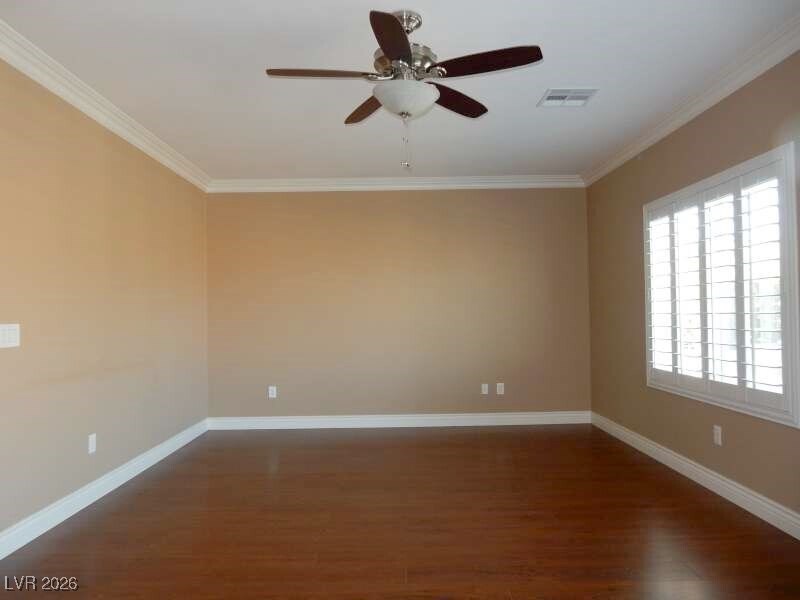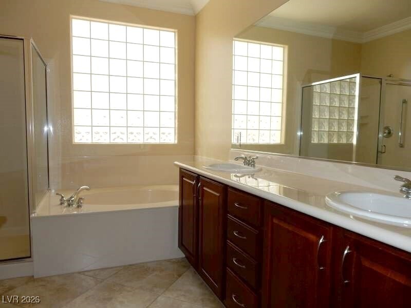 Highly upgraded Lincoln floorplan in the age restricted (55+) community of Sun City Anthem on premium elevated lot with Las Vegas Strip, City, & Mountain Views! Gourmet Island Kitchen features granite counters w/full backsplash, upgraded cabinets w/pull-out shelves, pantry, nook, breakfast bar, recessed lighting, & all appliances. Great room with ceiling fan, surround sound, and laminate wood flooring, and dining room with sliding glass door to rear yard. Primary suite features a ceiling fan, sitting area, door to rear patio, walk-in closet w/ organizers, dual sinks, raised vanity, garden tub, and shower. Secondary bedroom with ceiling fan and laminate wood flooring, plus a den/office with ceiling fan. Plantation shutters, laminate wood flooring, tile on diagonal, upgraded baseboards, crown molding, and custom 2-tone paint. Laundry Room w/cabinets & utility sink. Covered Patio, view deck, low maintenance landscaping, and so much more!