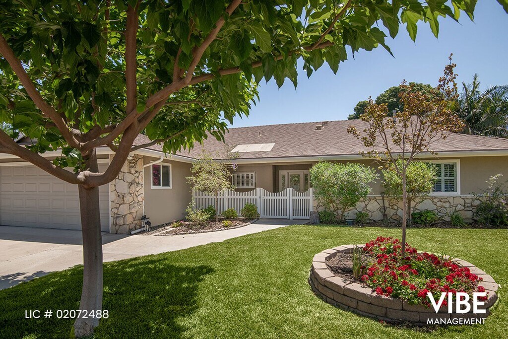 Perfectly situated in the middle of a quiet street in the Cameo Neighborhood of Newbury Park this quintessential one story home is a must see! 4 bedrooms all with ceiling fans & plantation shutters. A separate office with double glass door enclosure. 2 baths, one being an ensuite for the primary bedroom. New counter tops and sink in the kitchen mixed with beautiful wood cabinetry and a refrigerator included for tenant use. The home also features a fireplace in the family room, HVAC, Solar, attached 2 car garage with storage and a huge shed in the back with electrical. A plethora of fruit trees are sprinkled in the beautifully landscaped grassy yard. Possible Gazebo outside being left for tenant use. My favorite spot on this property............. the front covered porch behind a picket fence!! Walk to the elementary school, EARThs Magnet, services and restaurants! This is a must see! Things to know: We love pets & they are welcome and we will consider small ones at $25.00 more per pet per month. Gardener is paid for by owner and utilities are all the responsibility of the tenant. Owner Prefers a minimum of a 2 year lease. Solar on this property is owned. Refrigerator and freezer in garage is left for tenant use without warranty by owner. Owners are seeking applicants with credit of 650+, proof of income & solid reserves. Proof of these items will be required. Combined income should be close to or exceed $12,900.00 a month. This property is Listed by VIBE Management/SGAPM. All applicants will need to apply through our Management portal, we do not accept zillow applications or any other previously run credit reports. Renters insurance is required for this property. Thank you! Please contact Bonni for more information & to schedule with a min of 24 hours notice.