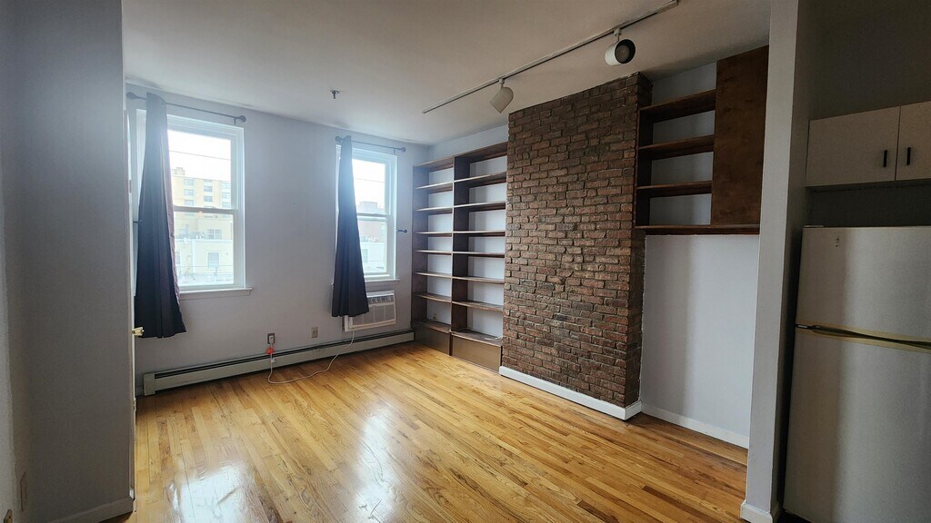 Charming one (1) bedroom condo with your own sunny deck! Hardwood floors, open Living room with Exposed brick & built-in shelves. Large bedroom opposite end. Galley kitchen, tile bath. Wall A/C in Living room & Bedroom. Great natural light. Close to Light rail, HOP, or quick walk to PATH. Common laundry in the building. No Pets, No Smoking. Tenant pays all utilities. Top floor unit (3 flights up).